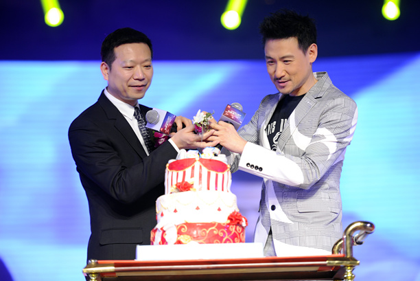 顧家家居董事長顧江生先生與顧家家居代言人張學友先生一起切慶典蛋糕