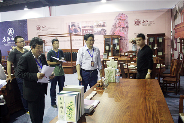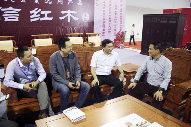 左2浙江省家具行業協會秘書長馬志翔在中信紅木展位上了解情況