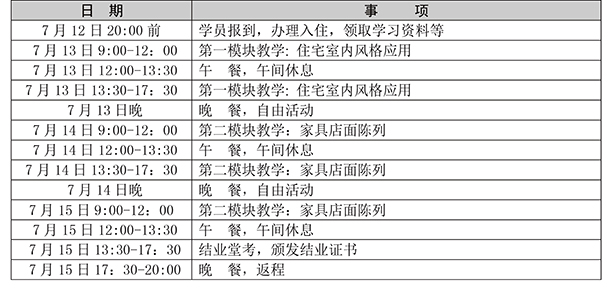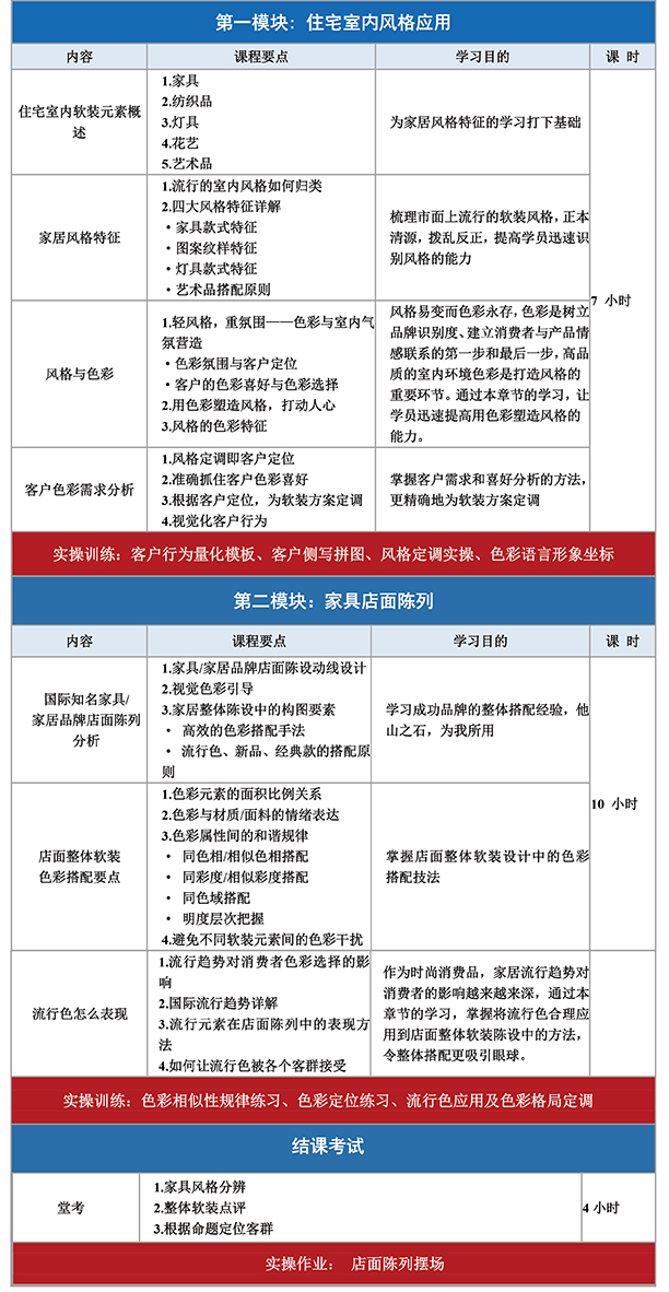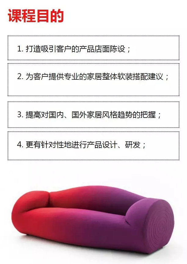 三、課程對象:針對家具生產企業、經銷商推出的家居整體搭配和設計課程。
