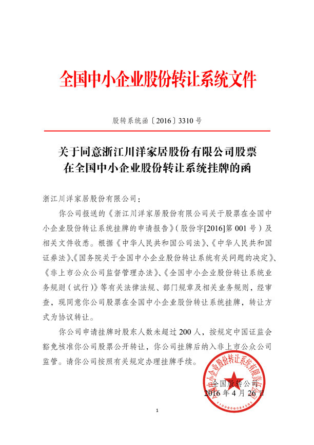 2016年4月26日,川洋家居在“新三板”即全國中小企業股份轉讓系統正式掛牌!股票代碼:837386。
