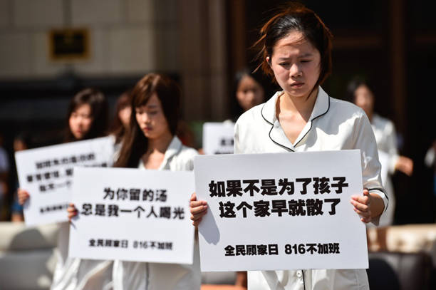 就在8月8日下午,上海地標環球港廣場,她們集體站了出來,舉牌向自己的丈夫抗議,控訴過度加班給家庭帶來的傷害。這種安靜沉默的行為,盡管沒有過多的動作,卻有著一股震撼人心的力量,讓經過的行人也不禁動容,紛紛停下腳步觀看。