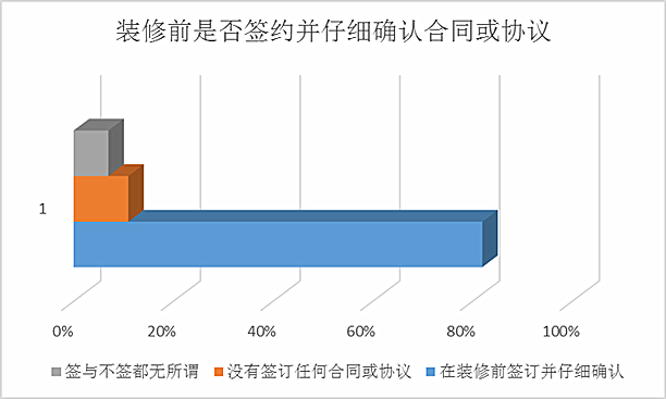 消費者除了對于家居用品以及裝修的擔憂外,經調查發現,有65%的消費者對于家裝行業的維權渠道和方式還不夠了解,維權意識有待加強,不過同與往年相比已有提高。其中,82%消費者會在裝修前簽訂并仔細確認相關的裝修合同,有11%的消費者表示裝修時沒有簽訂任何合同或協議,但仍有7%的消費者認為簽與不簽都無所謂。