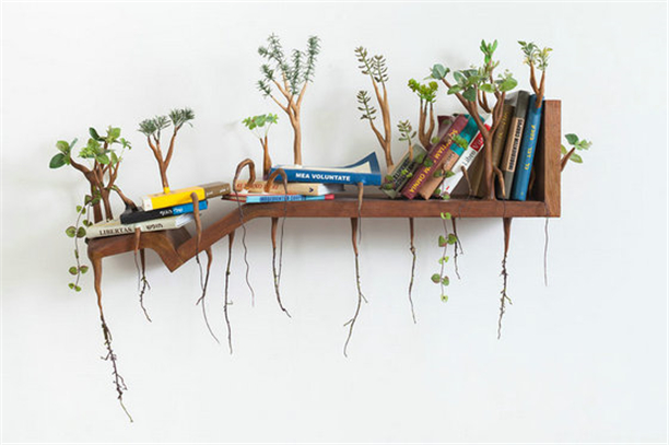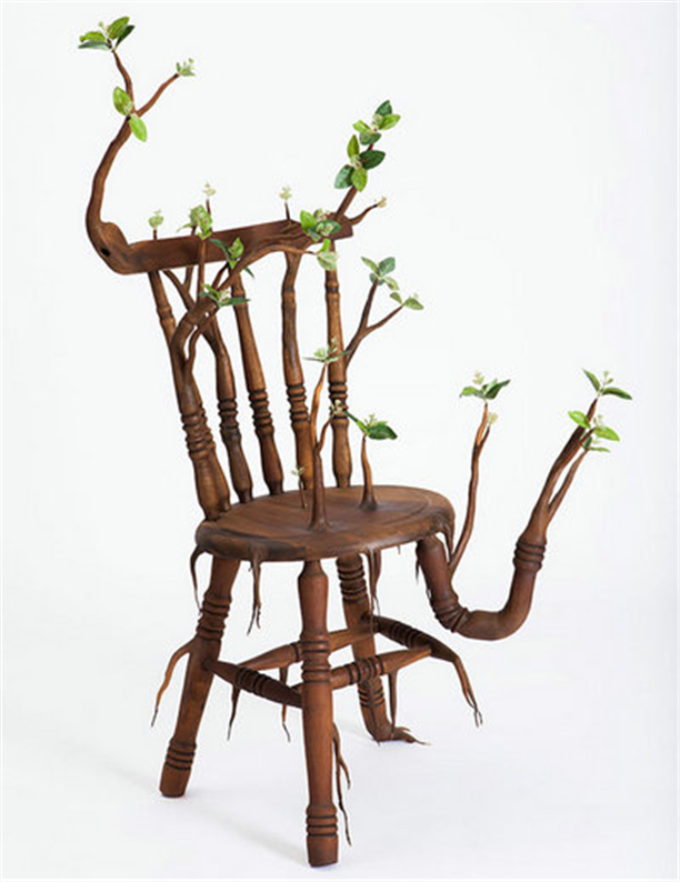 黎巴嫩藝術家camille kachani獨出心裁,開發了一系列與自然變化過程相關的家具。通過對自然元素最初的原始條件的研究,設計師對日常材料與物品進行了全新的詮釋,改變了它們的尺寸和原有功能,從而設計出混合的作品。具體說來,kachani 讓座椅、擱架、鐵鏟、耙子與書籍等日常家具用品上長出了細枝與嫩葉,試圖將這些物品帶回到它們原料的根源。