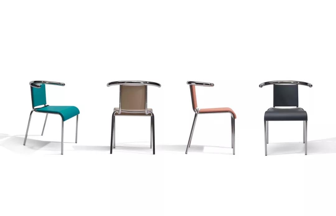 這把椅子用一根主體鋼管支撐起整個(gè)架構(gòu),椅子的座位和靠背采用軟模壓聚氨酯制成,表面采用彩色織物或是皮革裝飾,上方鋼管有沒有讓你聯(lián)想到大型動(dòng)物的角呢。