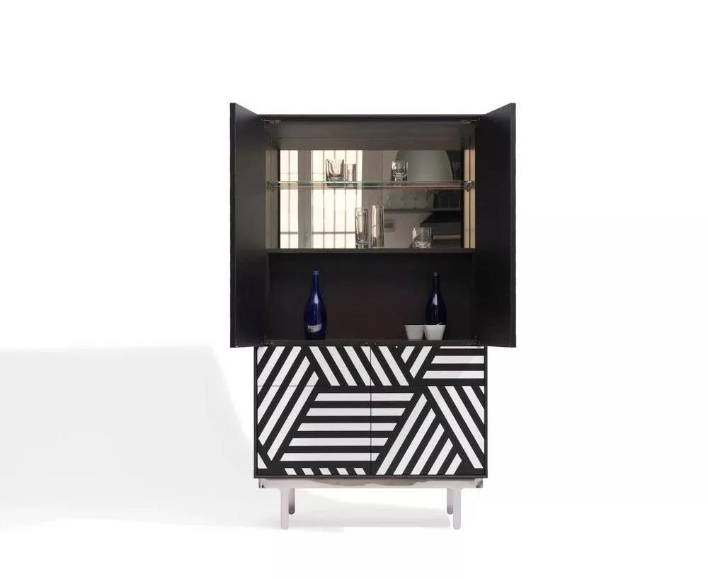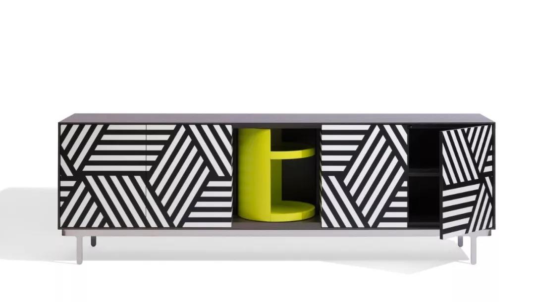 Alessandro 系列是三件不同形狀和尺寸的儲(chǔ)物柜,大膽的黑白幾何圖案在視覺上隱藏了柜門和抽屜的邊緣。其中最纖長的那件儲(chǔ)物柜,設(shè)計(jì)師在柜子中間隱藏了一個(gè)熒光綠的吧臺(tái)腳,充滿小心思。