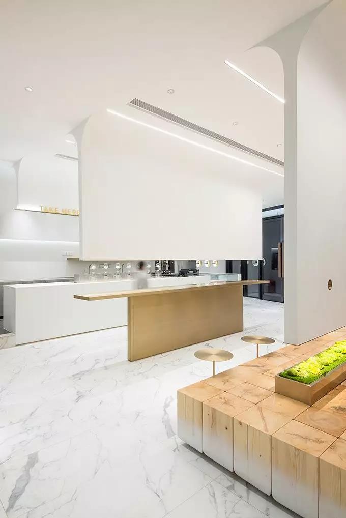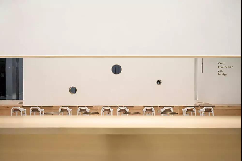 白色漸變油漆結(jié)合定制杉木座椅,同樣源于對奶蓋的聯(lián)想