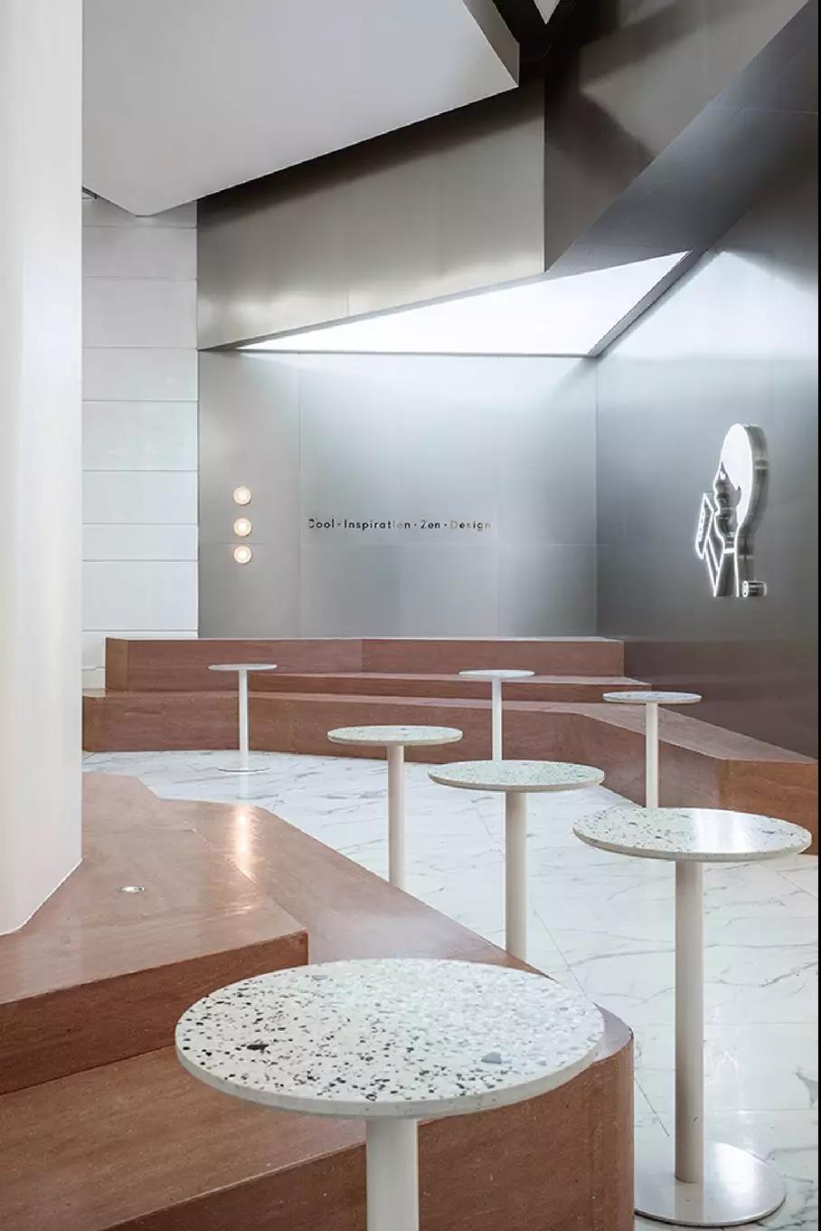 位于商場室內(nèi)的外擺區(qū)域選擇金屬與洞石的材質(zhì)搭配和階梯狀的座位形式,整體更為輕松、更具活力,呈現(xiàn)開放和歡迎的狀態(tài)。