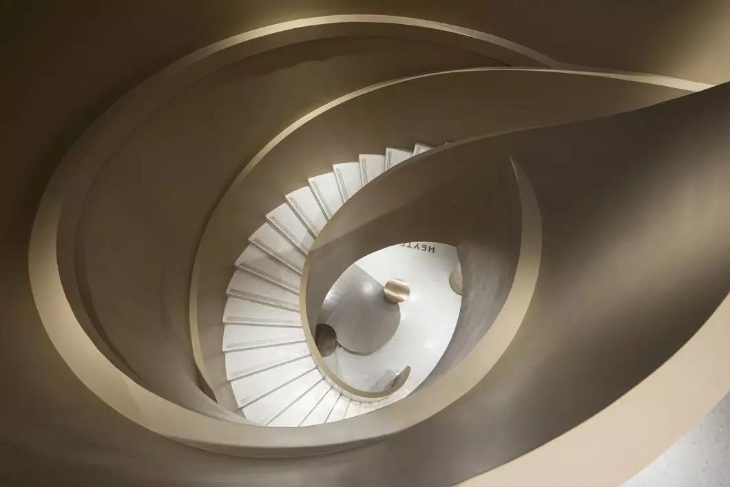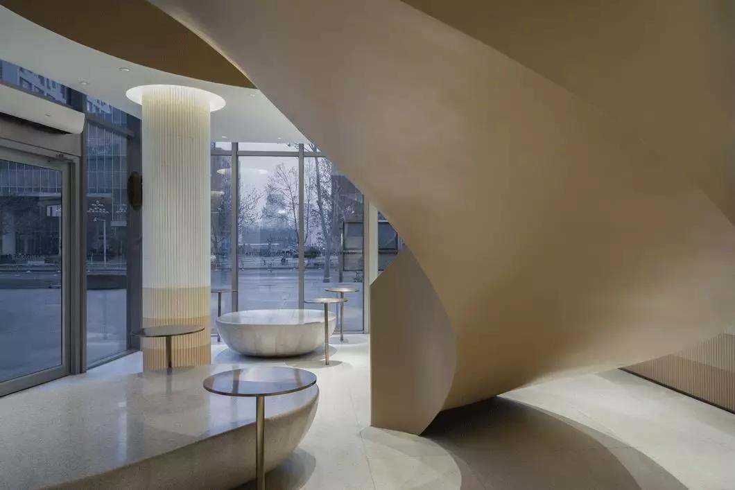 旋轉(zhuǎn)樓梯是空間中的主角,人們在店內(nèi)的活動圍繞著它進行,它也成為顧客們喜愛的拍照背景甚至到店原因。