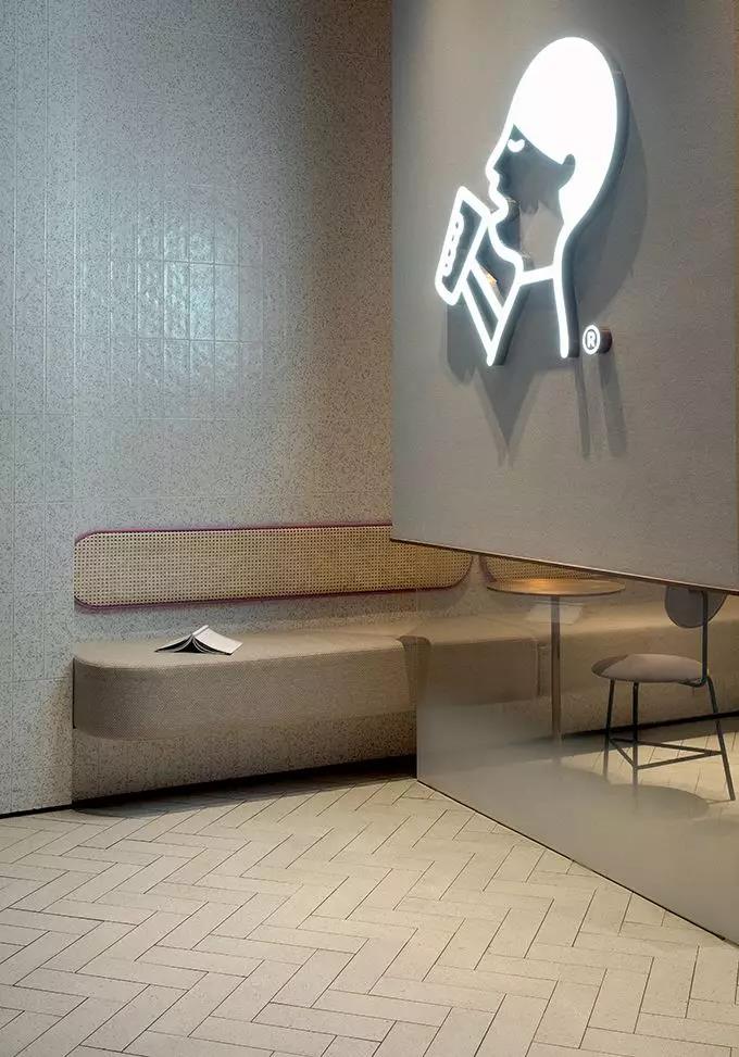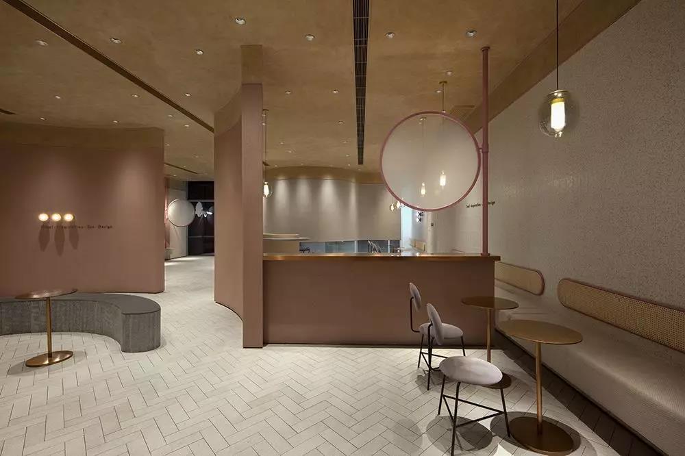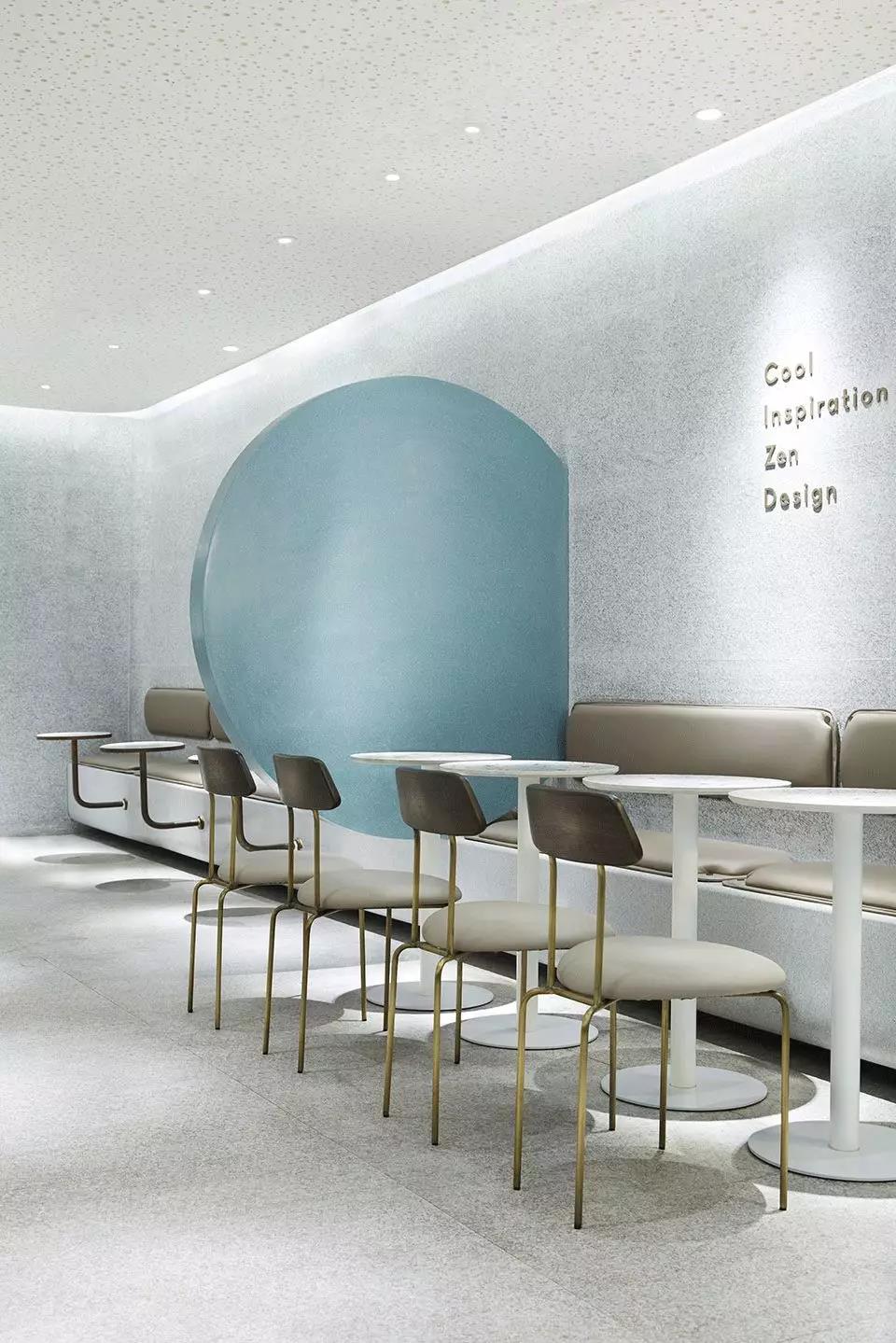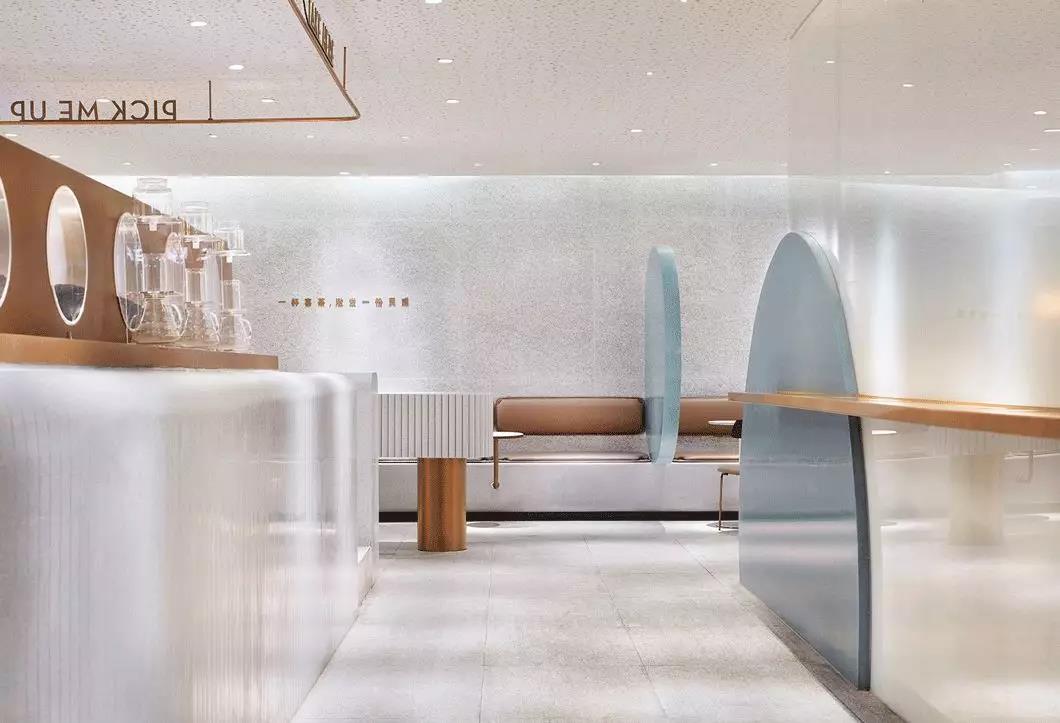 天花造型向下與吧臺形成呼應(yīng),與面向兩側(cè)的定制座椅相結(jié)合,而圓形開孔處理讓人聯(lián)想到奶蓋中的氣泡,增加靈動趣味的感受并增強空間的社交屬性。