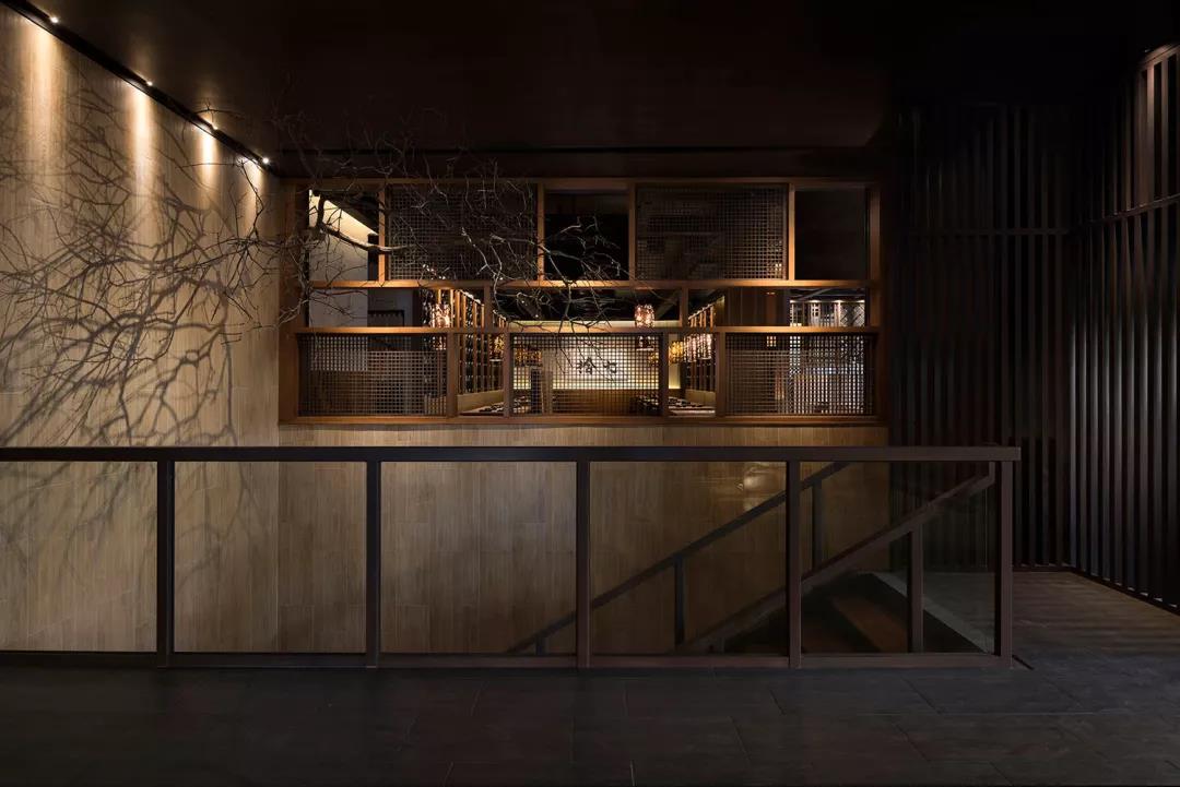 如果說一樓是對日料儀式的致敬,那麼二層就是對實用空間的打造了。沿著線性的燈光,踏階而上,伴隨著左側千姿態和風人偶的立面,仿佛用一種方式敘述著日式對客人最高的歡迎禮。右側條型隔柵組成的扶欄結合著光影,客人通過的過程,光影斜射,樹影婆娑,剎那間你已是景中之人。