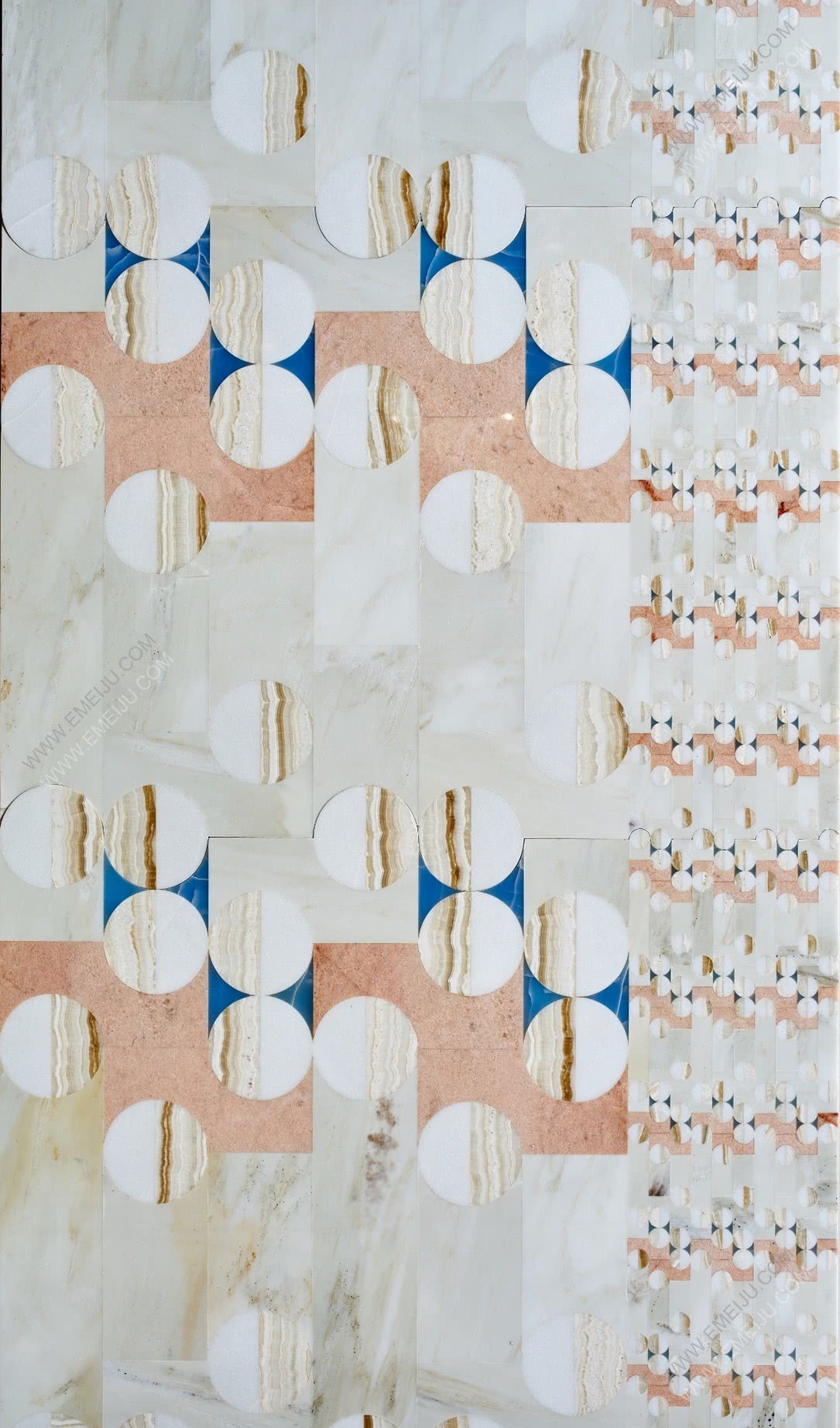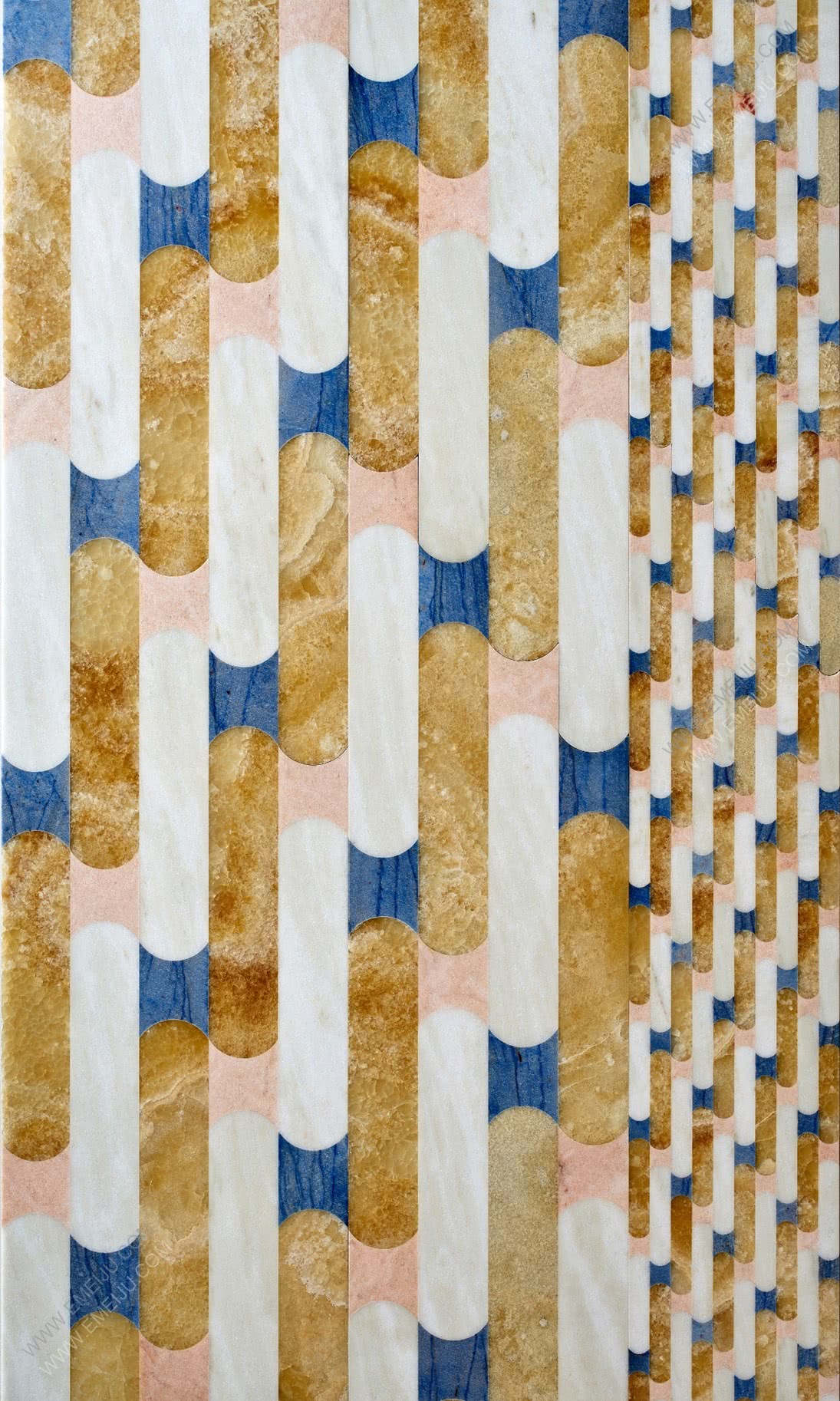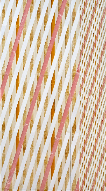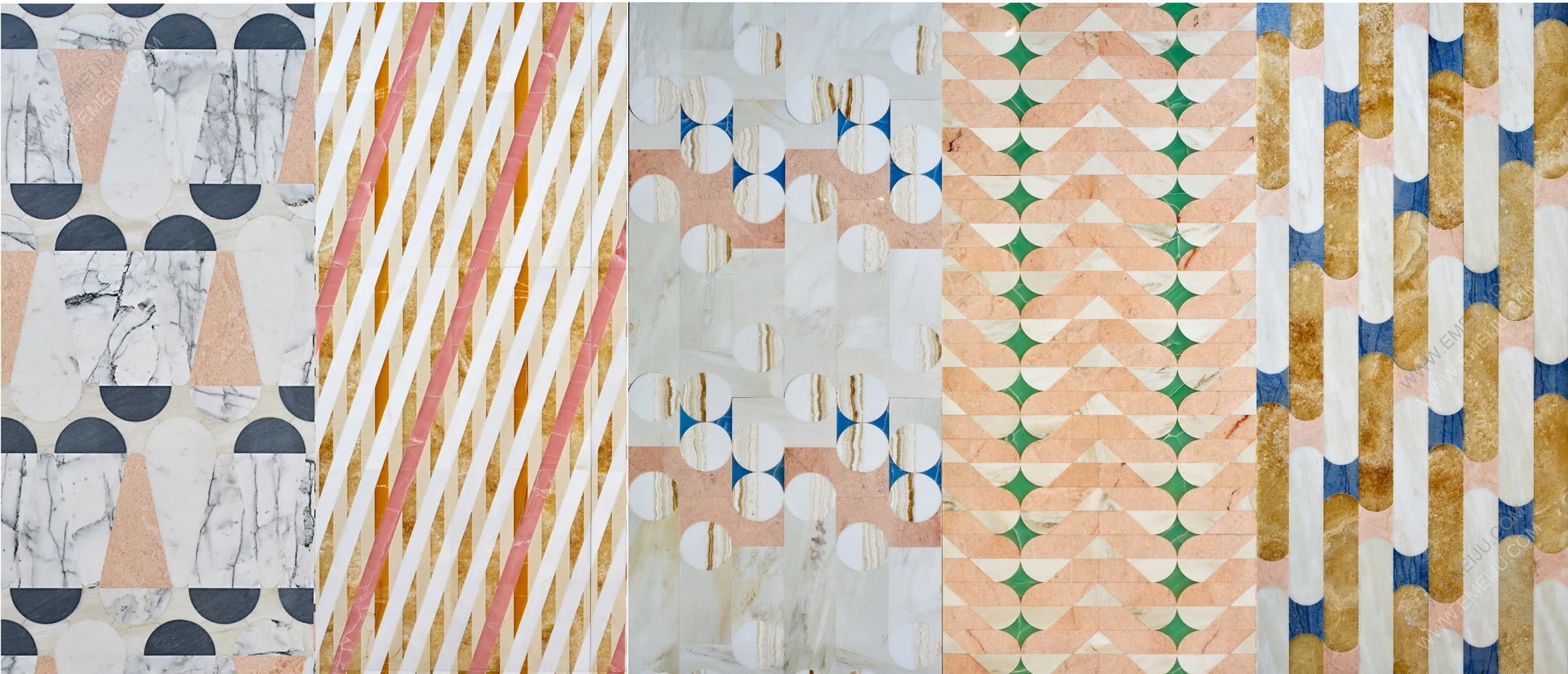 Papiro系列的五個圖案分別是Bianco Sivec、Bardiglio、Bianco Carrara、Rosa Portogallo和salmon pink。這些圖案在語言和形式上都是多樣化的,都采用了柔和的色調、材料以及由玫瑰色,海藍色和黑瑪瑙鑲嵌。