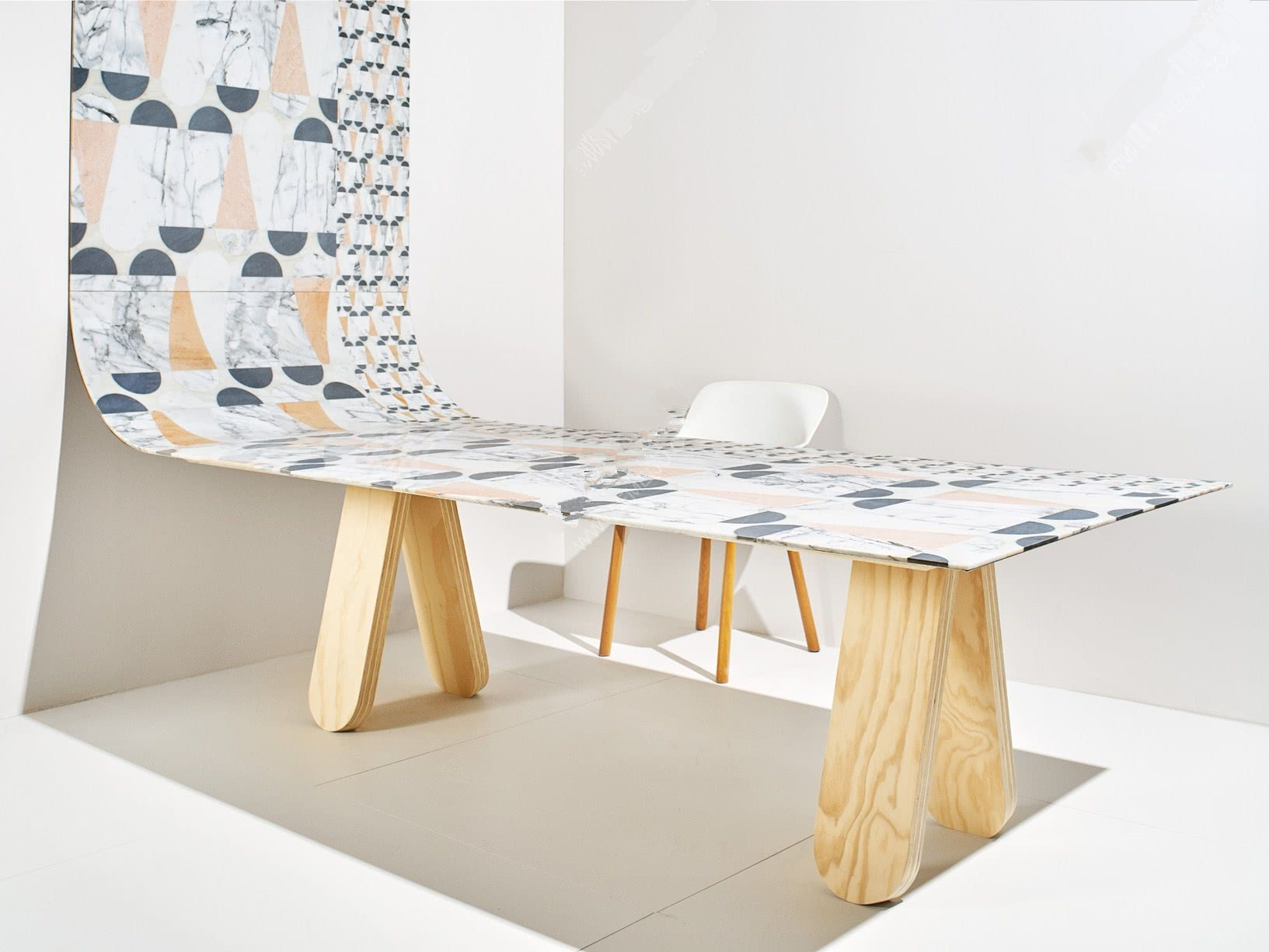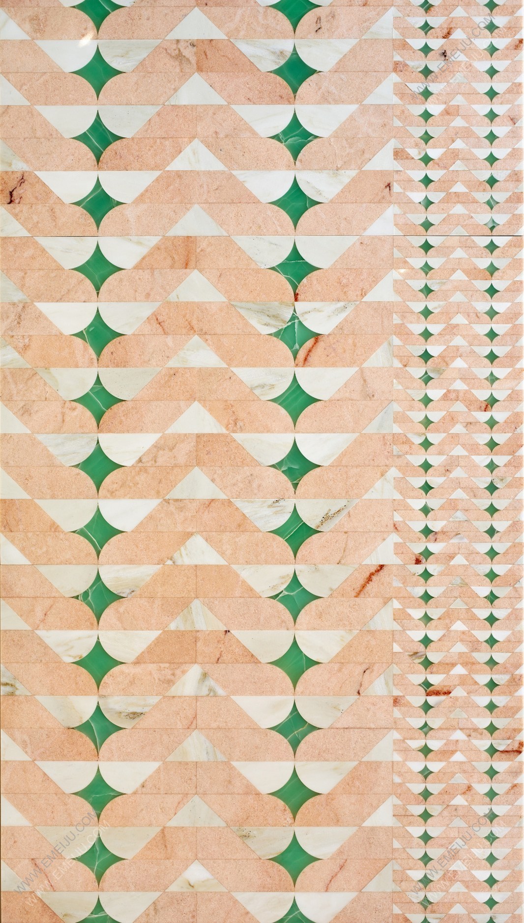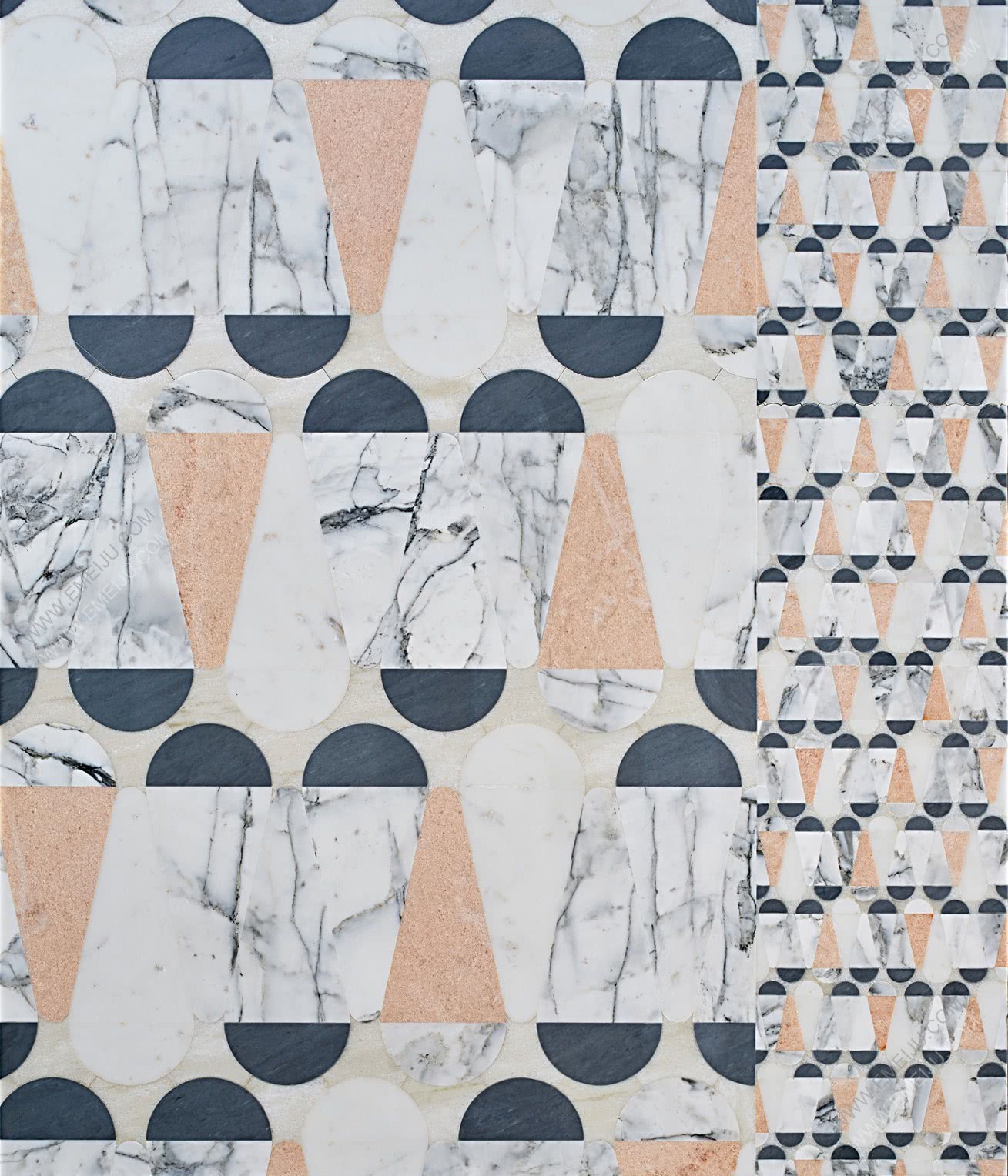 Papiro系列的五個圖案分別是Bianco Sivec、Bardiglio、Bianco Carrara、Rosa Portogallo和salmon pink。這些圖案在語言和形式上都是多樣化的,都采用了柔和的色調、材料以及由玫瑰色,海藍色和黑瑪瑙鑲嵌。