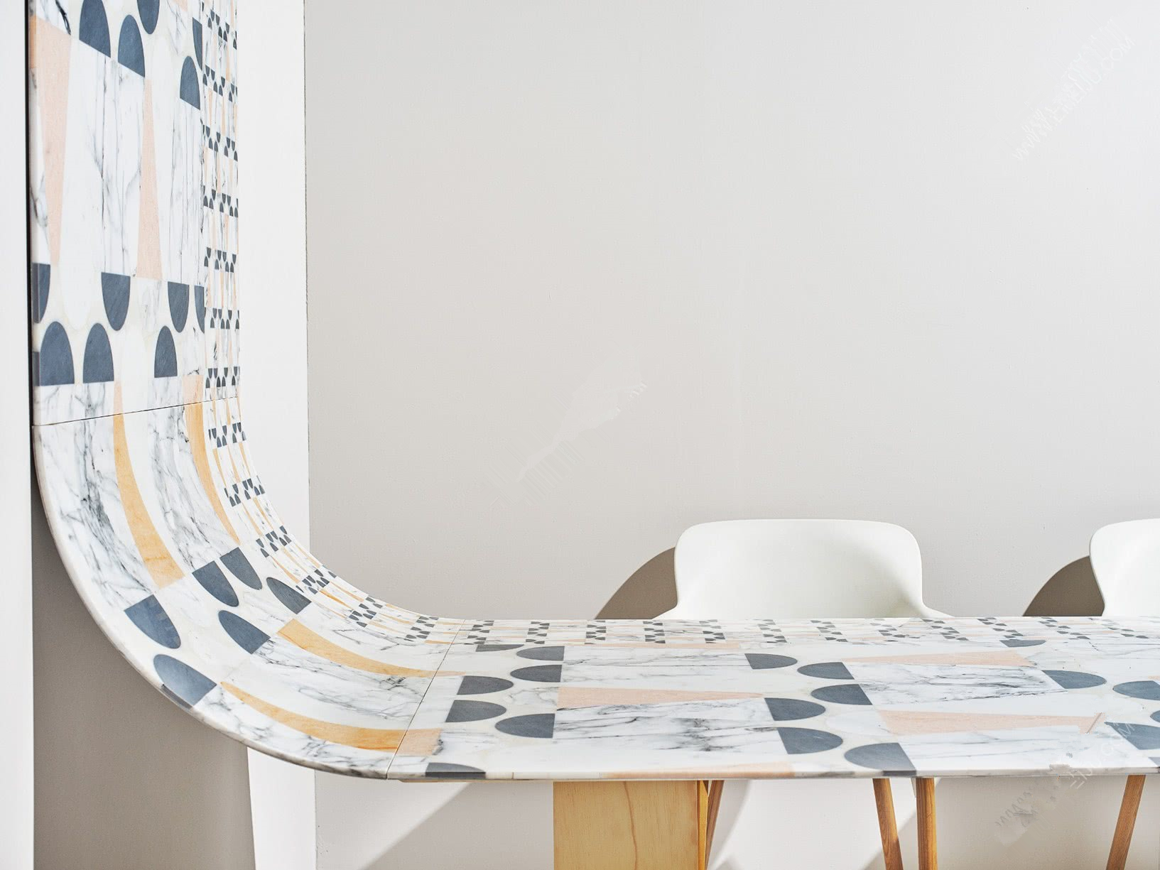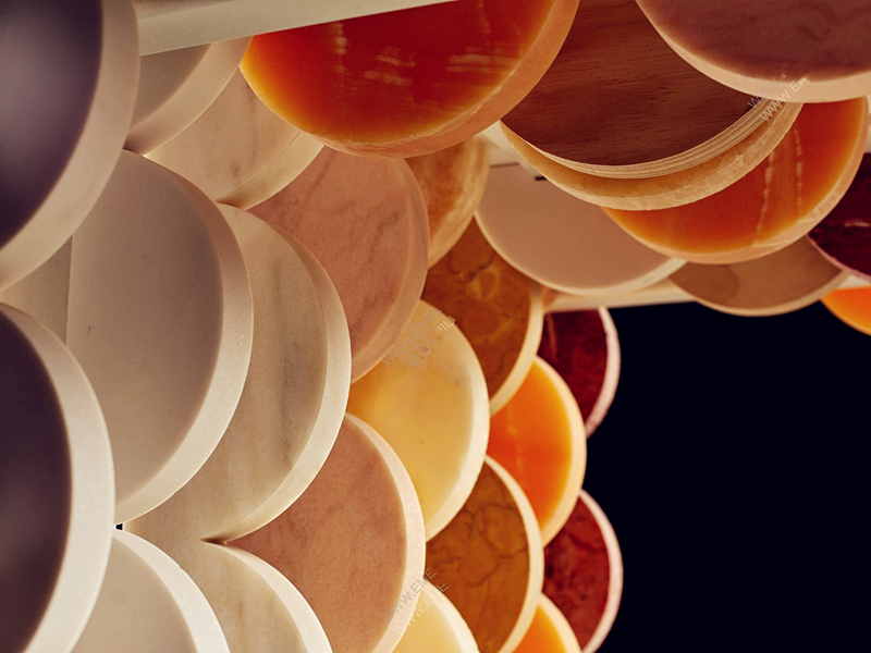 正是憑借著Papiro的作品,Budri獲得了2015年意大利最佳設計獎一等獎。Mirandola公司擁有半個世紀的精細大理石和半寶石加工經驗,通過這個系列,Mirandola再次探索了大理石的輕盈、詮釋空間和不斷變化的容量新概念。Alessandra Budri解釋說:“紙莎草紙是文壇的一次真正的變革。同樣,Papiro系列徹底改變了大理石的世界,一卷墻紙被蝕刻在大理石上,上面有五種不同的裝飾圖案。”易美居選材發現在項目進行的過程中,Papiro系列展示了大理石加工、多色材料鑲嵌表面的設計演變。傳統工藝增強了色彩,凸顯了它的獨特性。圖形元素相互交替展開,直到到達地面。墻壁的大理石覆層被詮釋成一個平面、第二層表皮、一張由智利松樹打造的桌腿支撐著。