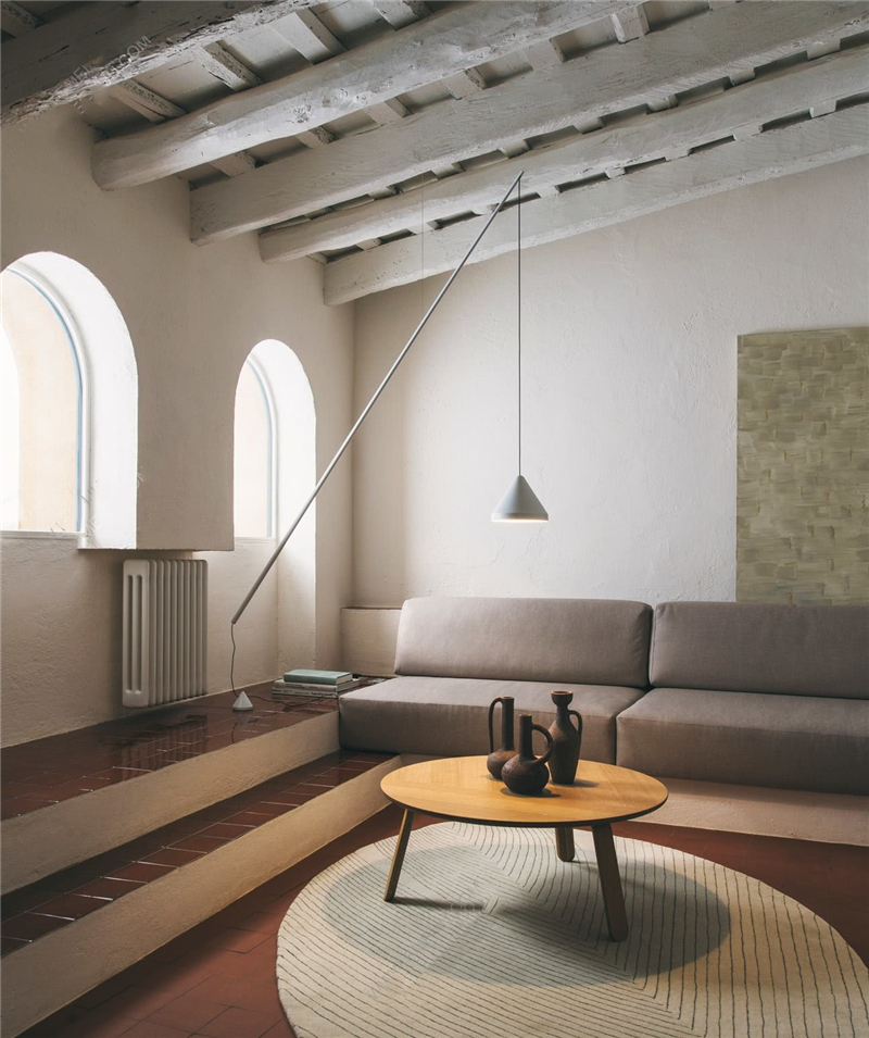 由解構設計定義的,Arik Levy設計的North Floor吊燈結合了落地燈和吊燈的特色,Levy的目的是在視覺上將地板和天花板連接起來,而無需對墻壁進行布線,而是將燈光精確地放置在需要的地方。它由三個獨立的部分組成,一個三角形的鋁制燈罩,一個LED供電的光源,一個細長的碳纖維桿和一個與電纜相連的地面配重,代表了一個動態的可調部件系統。