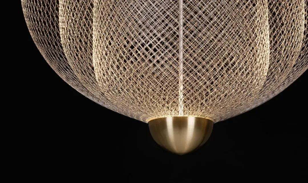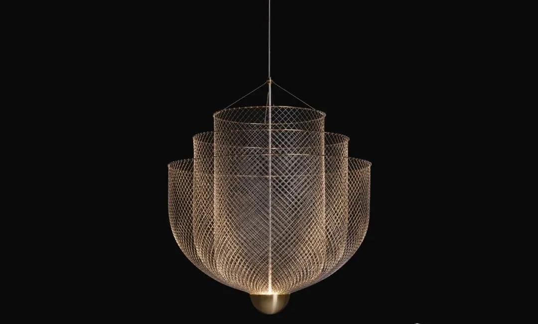 由Rick Tegelaar設計的Meshmatics枝形吊燈,現在有兩種尺寸,具有相同的金屬絲網。三個網狀層合在一起形成陰影,使光線可以通過網格開口逸出。