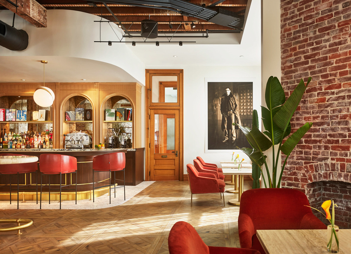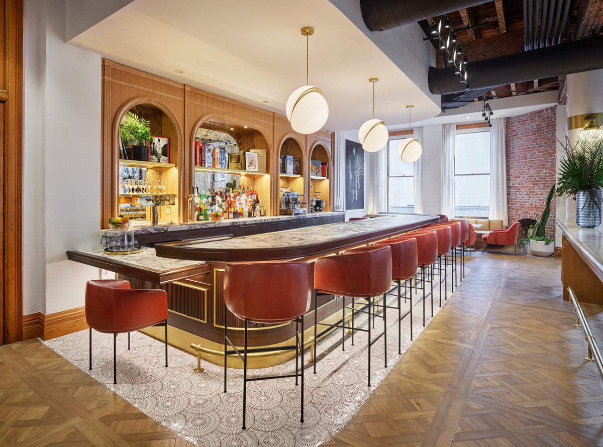 在酒吧,NeueHouse的共同工作人員坐在大理石頂吧臺旁的玫瑰色凳子上,可以一邊享用咖啡或雞尾酒。LEE BROOM設計的球形吊燈懸掛在頭頂。