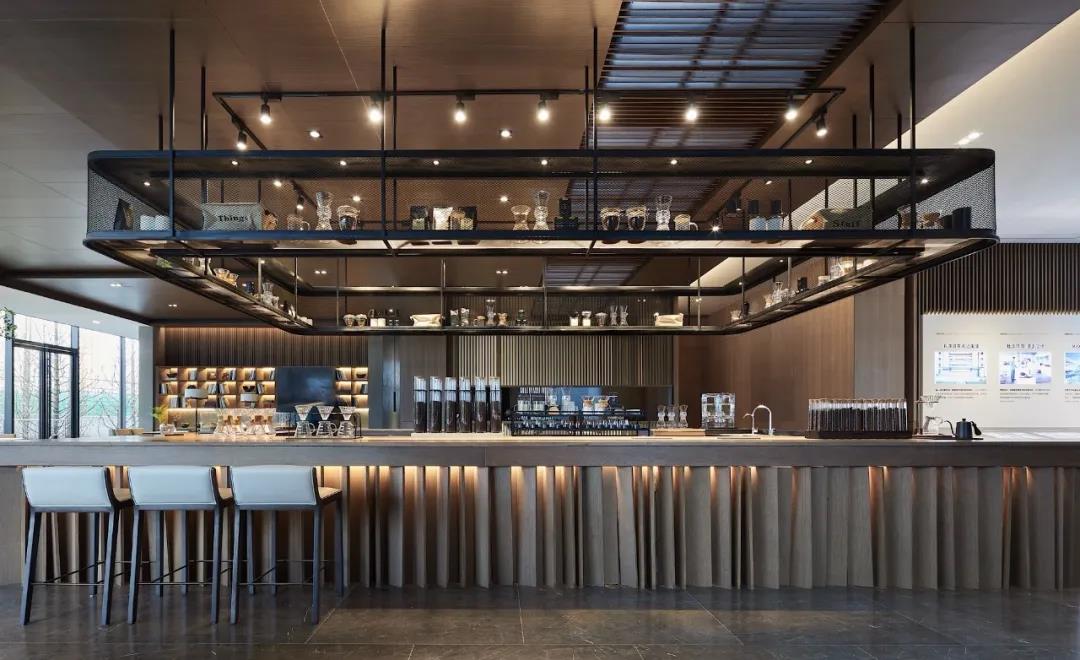 水吧區是整個一層的核心。取法自然,就地取材,天人合一,與土地為善,懷著環保、自然、低碳的材質宗旨,通過取景于自然,運用自然中常見的元素(枯枝、綠植、實木、石材)來建造極具自然雅致的空間。