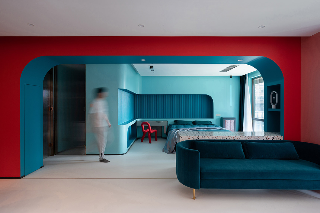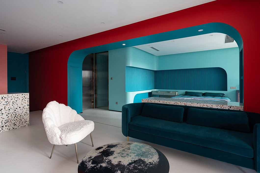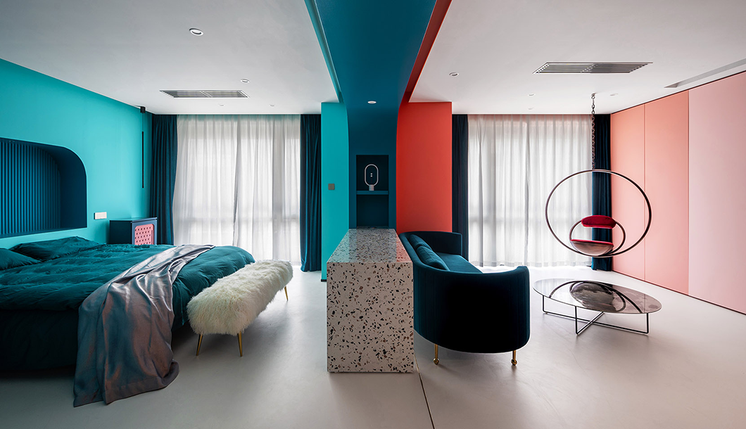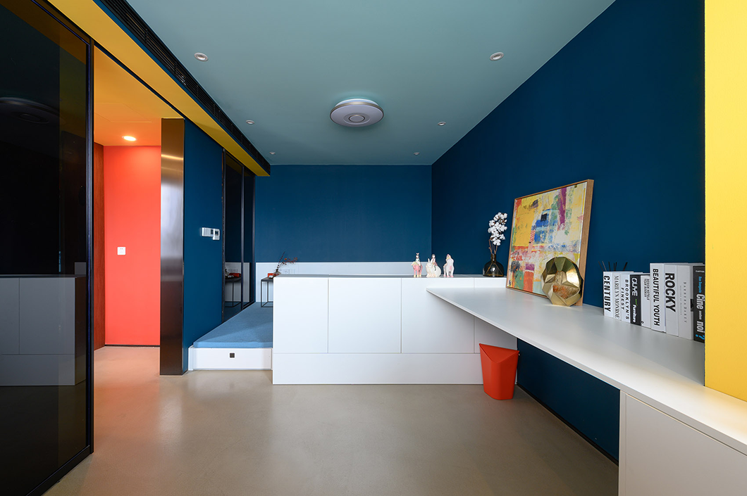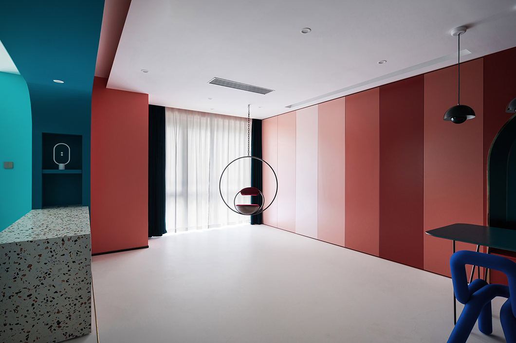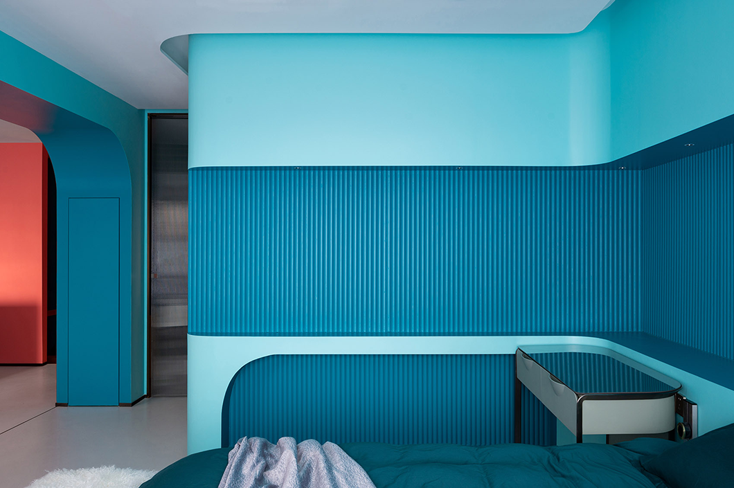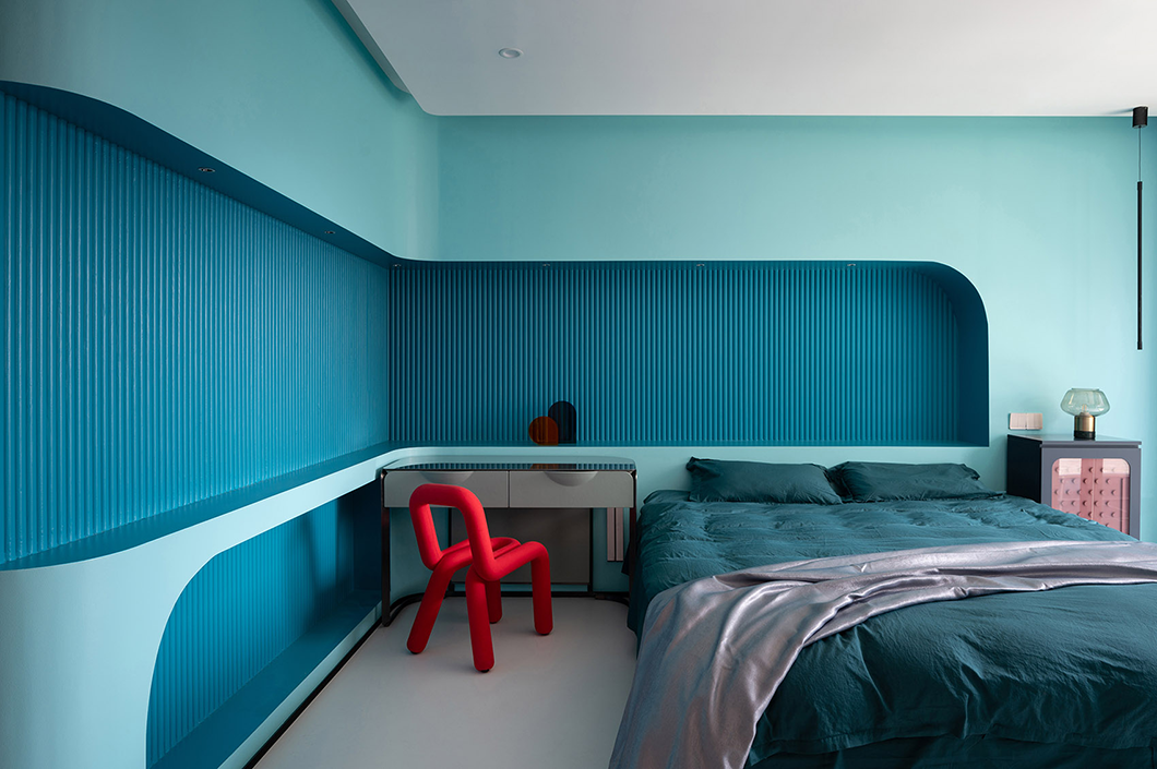 整個空間采用冷暖兩種色系,曲線的造型處理,在滿足功能需要的同時增加使用者不同的體驗感,與業主對色彩的喜好相符。