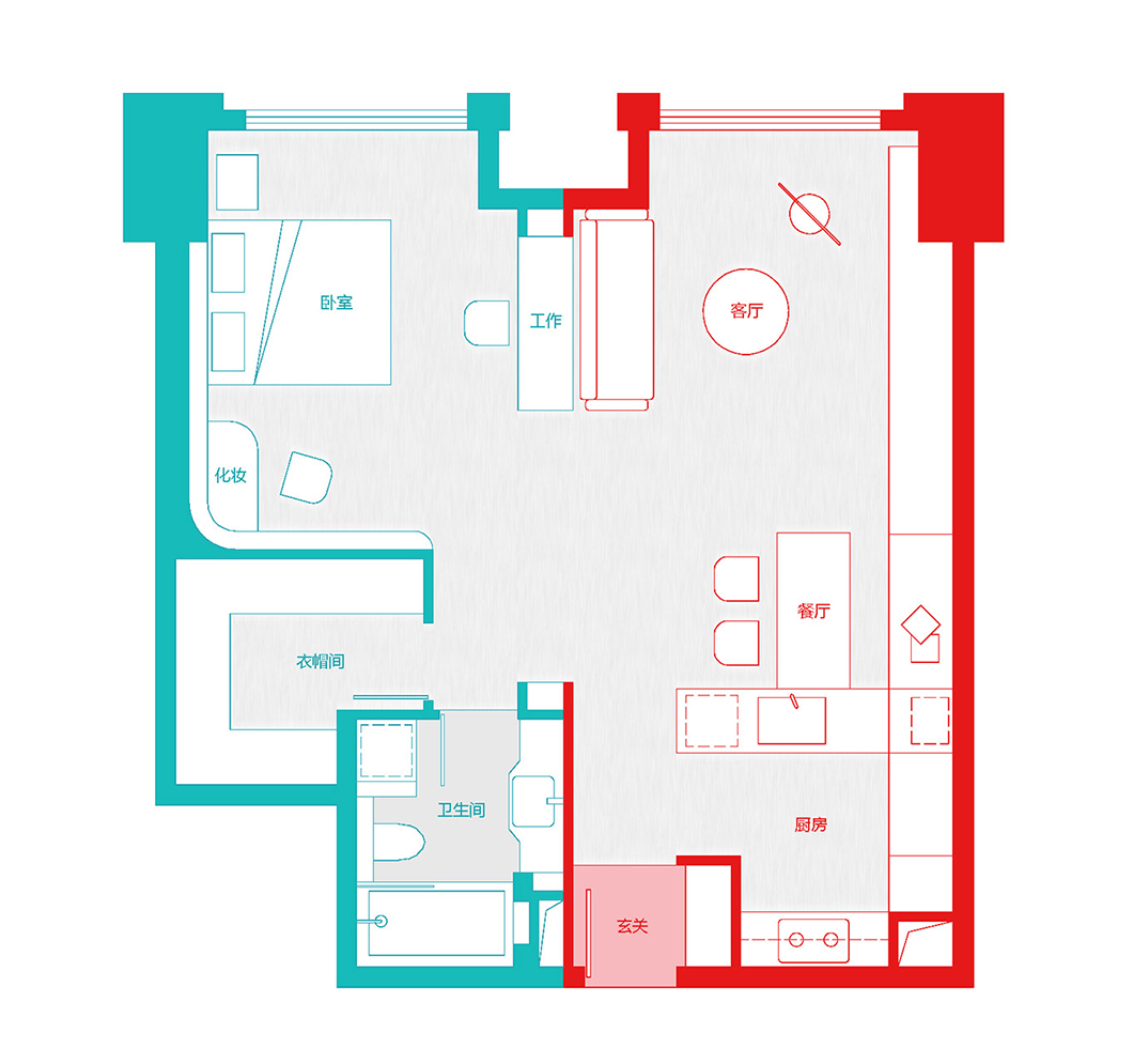 考慮業主一人獨居且光線較暗,設計師打通兩個開間的隔墻,形成一個開放的混合空間。