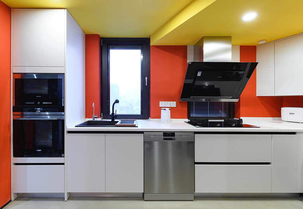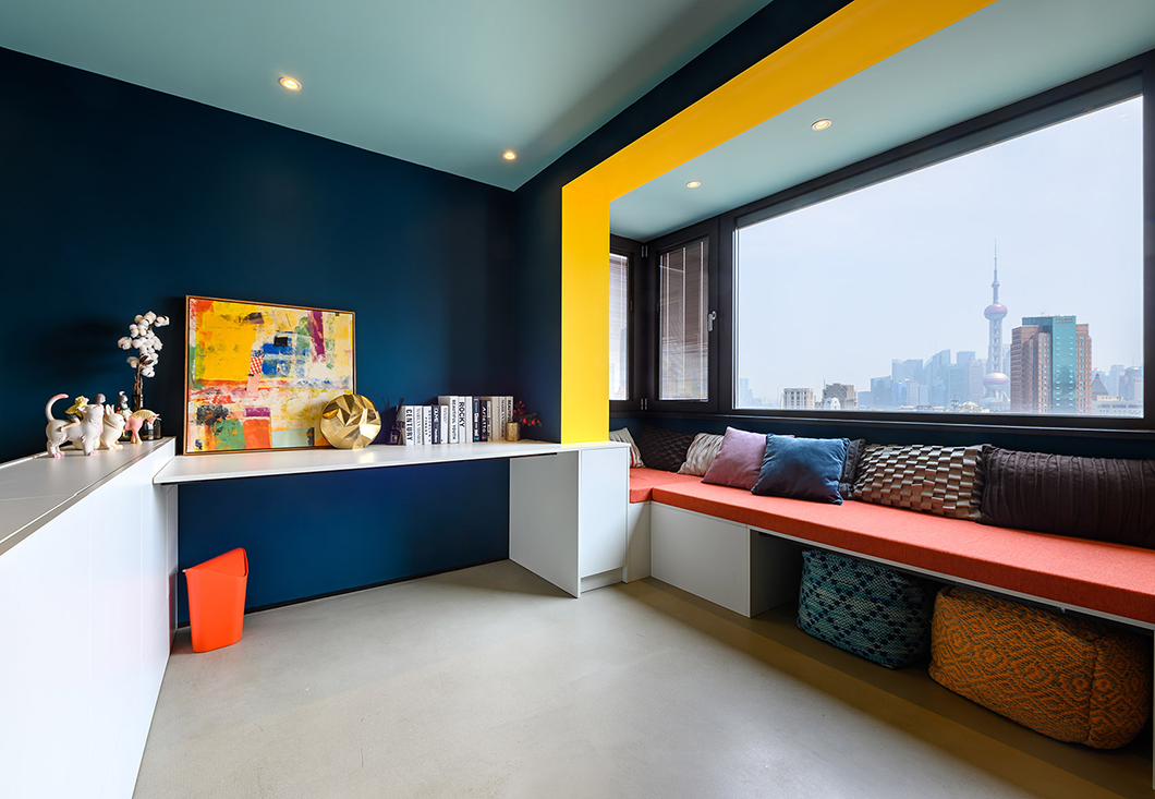 房間采用跳躍的色彩搭配,營造出年輕活力的氛圍。暗色搭配條狀明黃色讓狹小的空間秩序感更強。