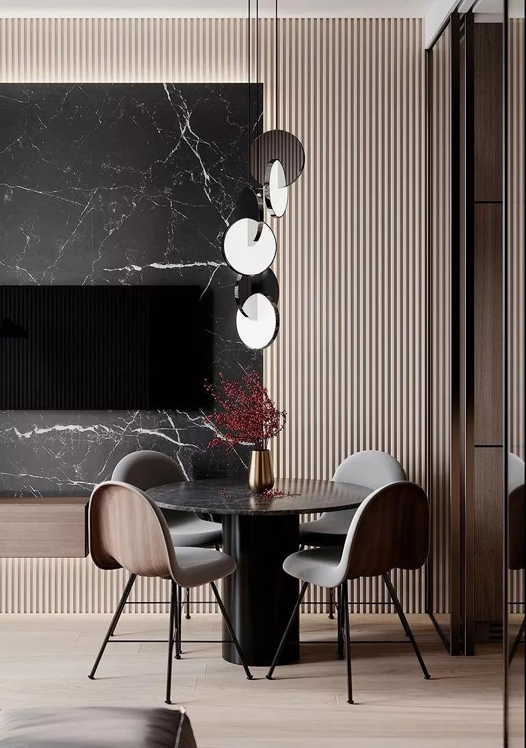 客廳布局造就了開放式生活空間,簡潔的木格欄墻裝飾,與黑色大理石材質的電視背景墻搭配,在加入金屬元素,形成了冷暖材質的對比。