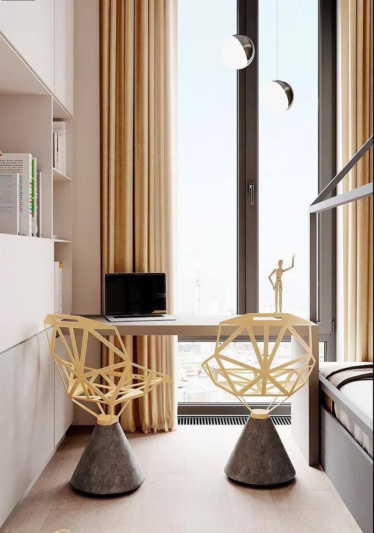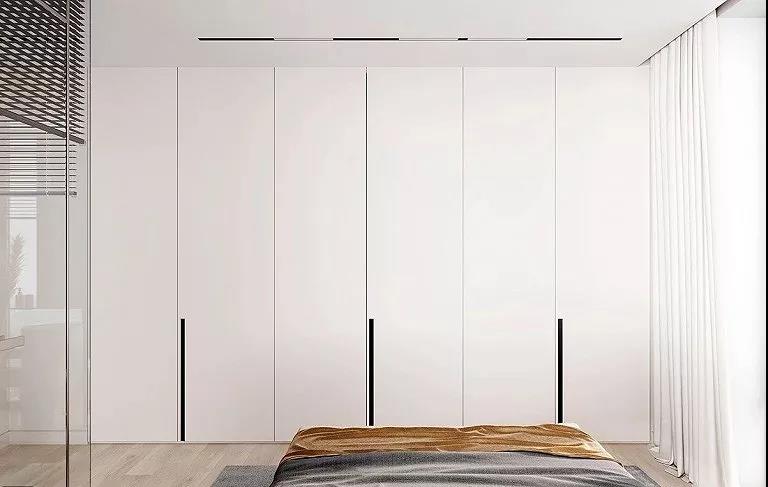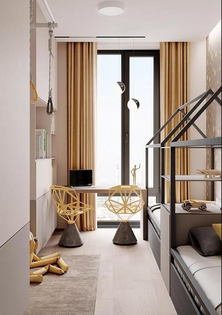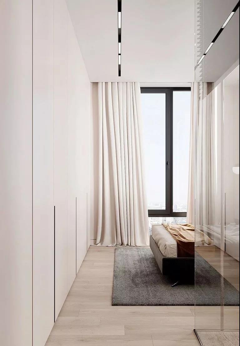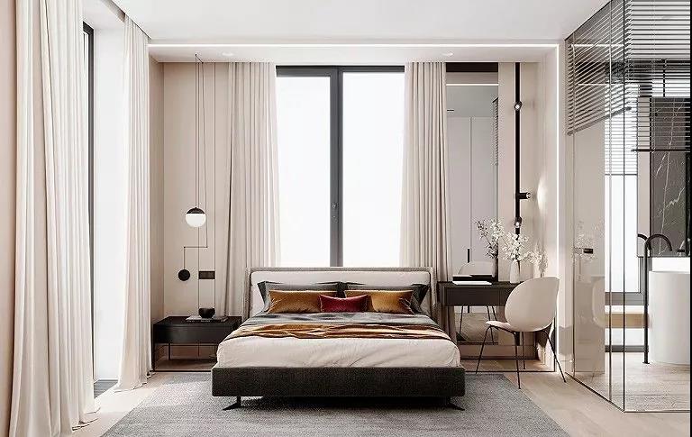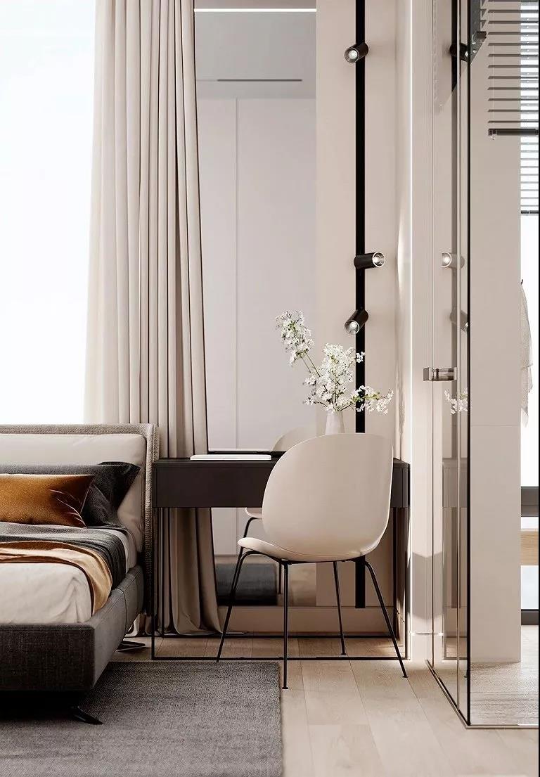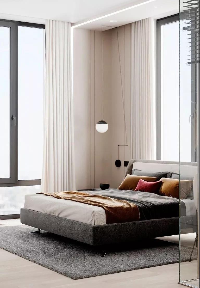 主臥太驚艷了,兩面都是落地窗,米色的窗簾純凈優雅,從天花板延續下來的燈帶成了點睛之筆,床鋪和地毯都用了灰色,配上金色的枕套,將時尚與精致,輕奢與優雅真實展觀出來,這大概是時尚的最好寫照。