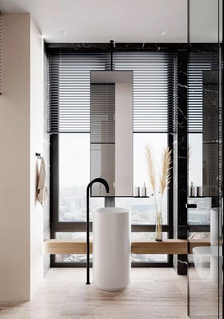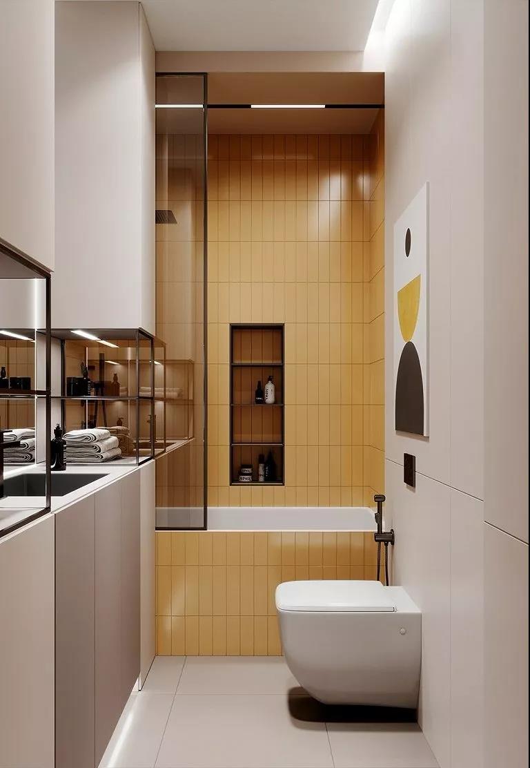 小小的衛生間,干濕分離,黑色的墻,木紋的地磚,簡約的線條很有藝術性,讓空間顯得更為精致。
