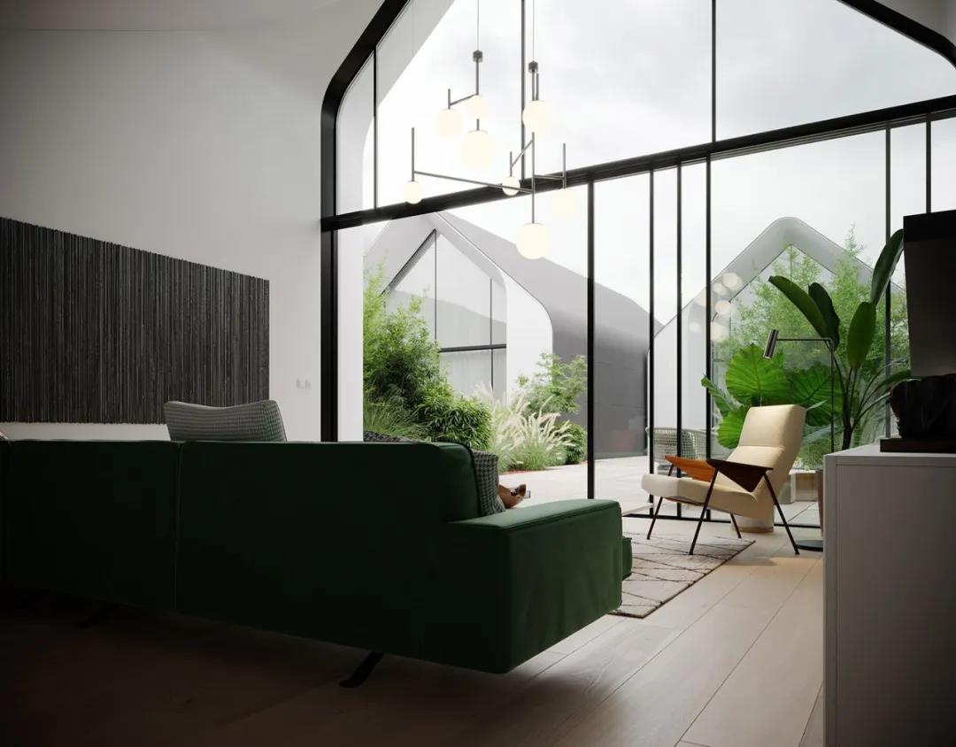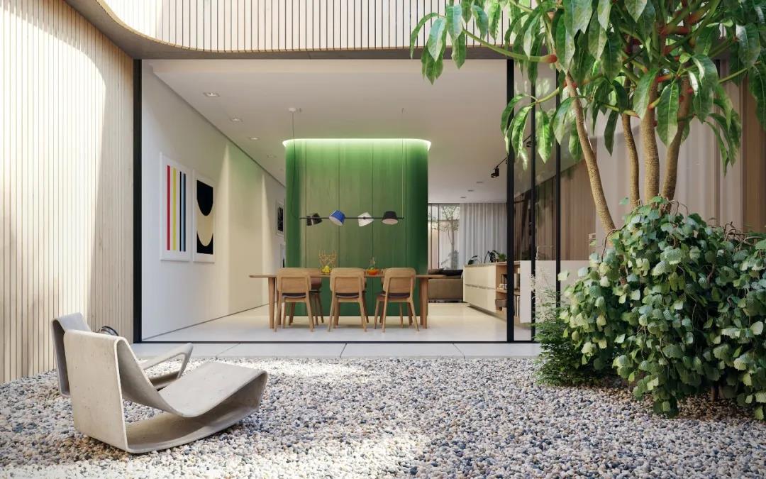 中央位置是客廳的延伸部分,空間寬敞,木墻則帶來只有自然界才能感受到的平靜感。鵝卵石上的臺階聲和餐廳中空蕩蕩的綠色,用柔和的筆觸描繪出寧靜的氛圍,并帶有深深的個人感情。