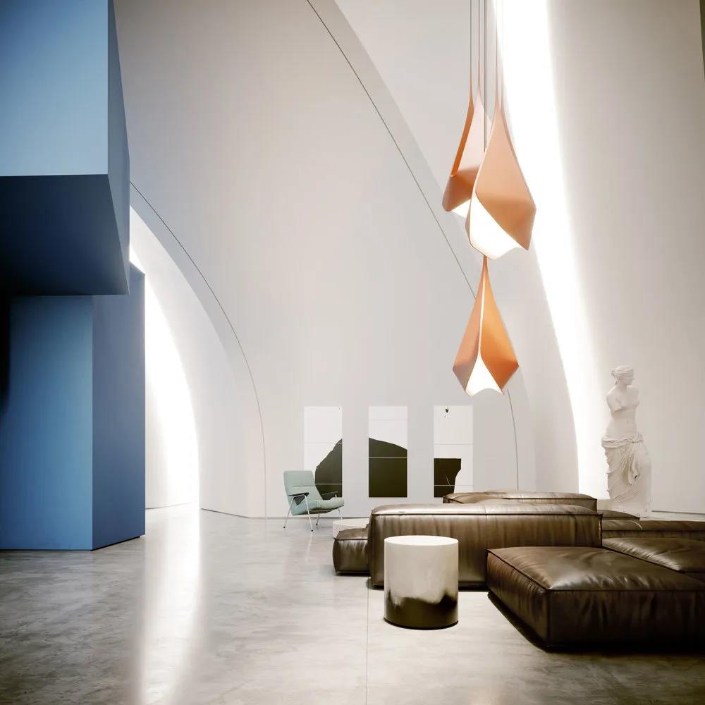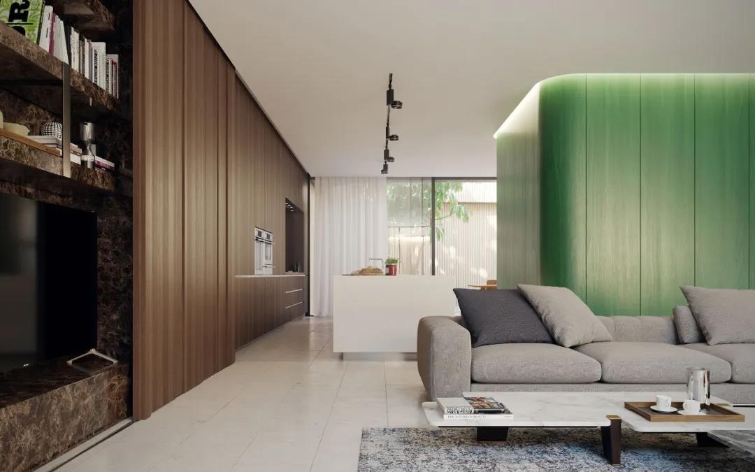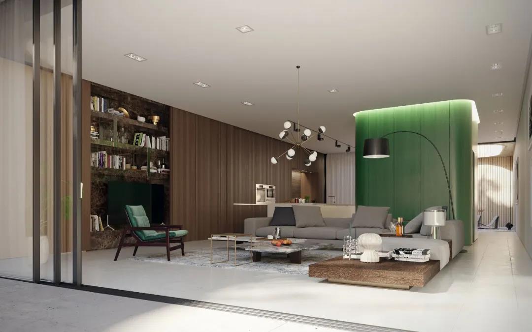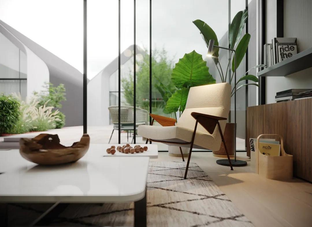 客廳和中央空隙都以泥土色為主調,營造出溫馨的氛圍,敞開以讓不同能量的路徑交叉,中央的空隙也與世隔絕。