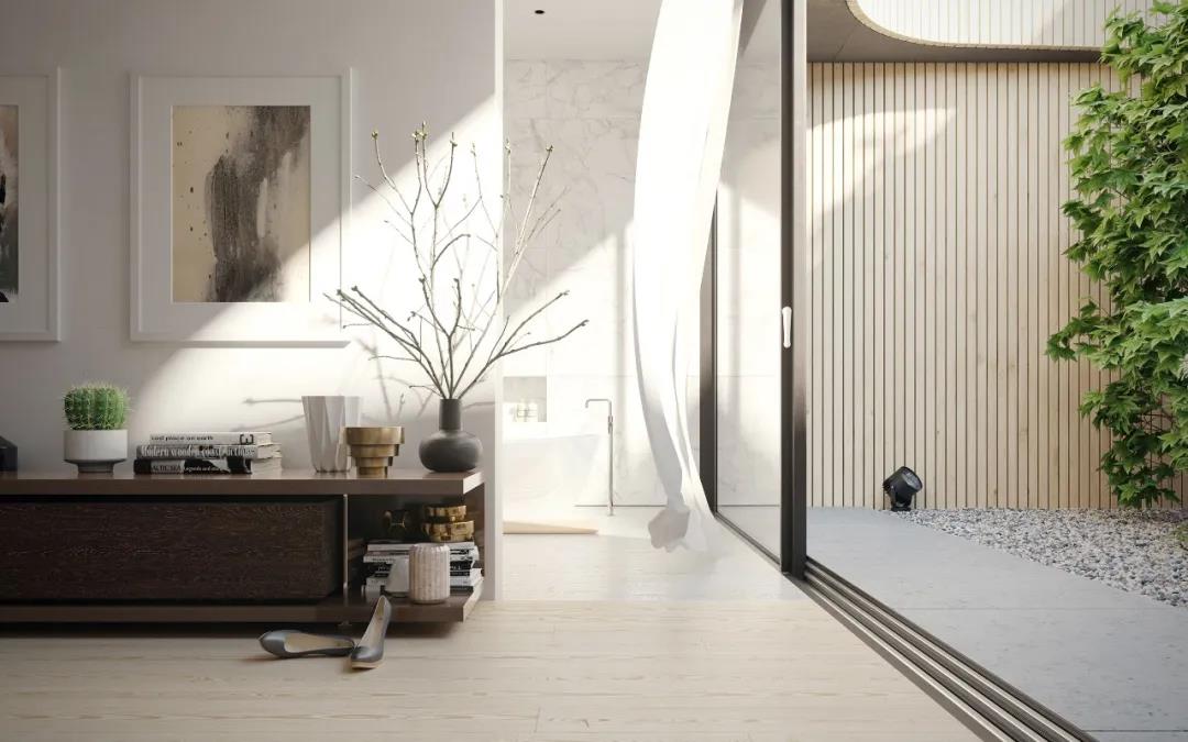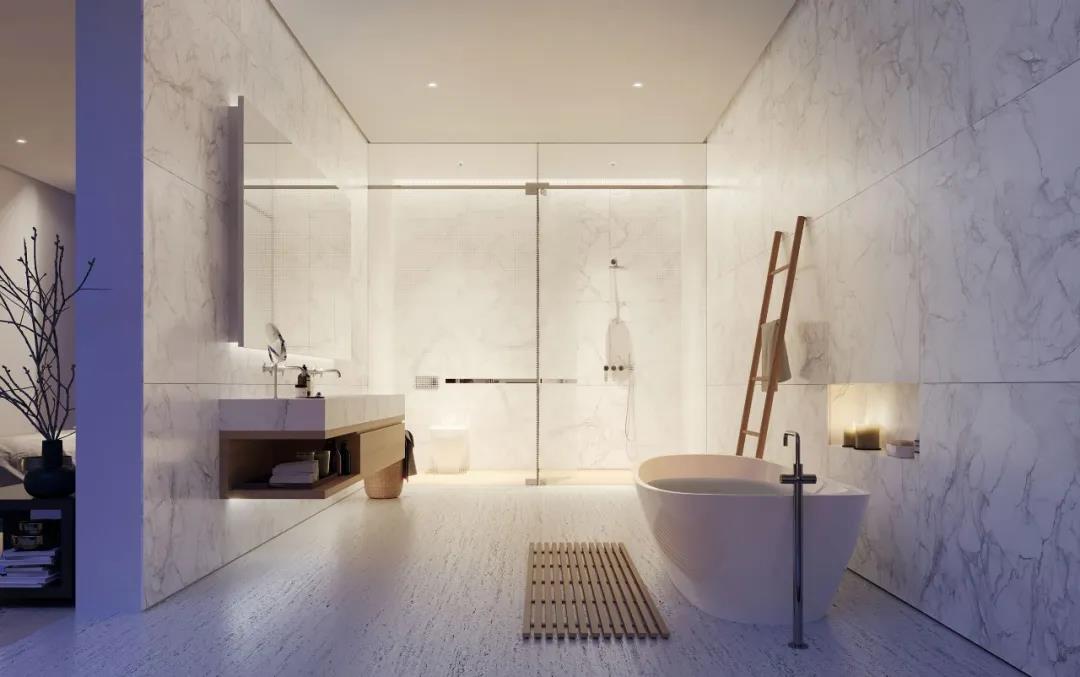 簡約的浴室,隨著沐浴鹽的香氣撫摸著淡淡的大理石墻壁,浴室流入小空間,變得既內又外。