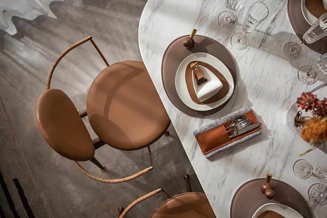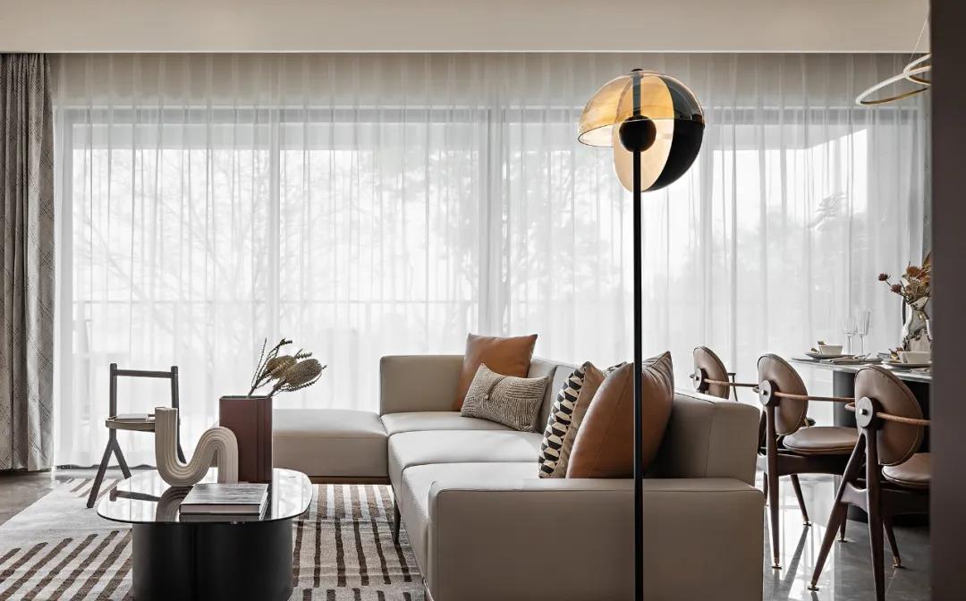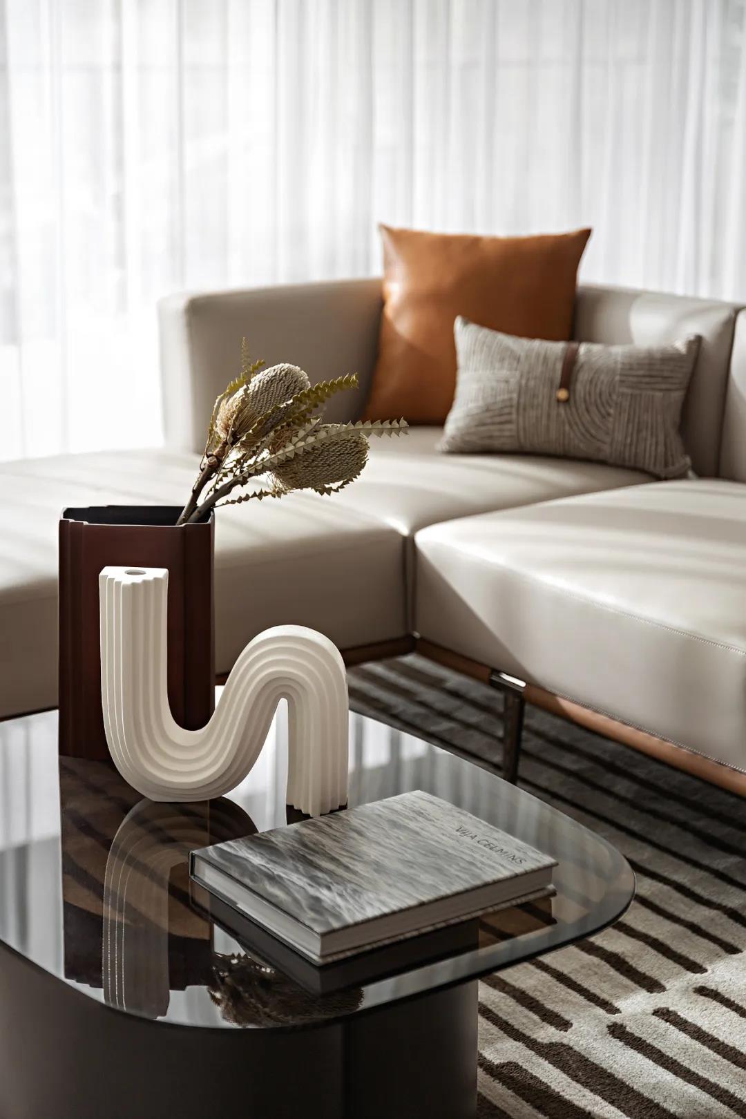 本案設計將“秋色”作為情境營造主題,選用暖咖色皮革作為勾勒空間的靈魂元素,再加以原木、金屬、布藝、天然石材等質感相異的材料進行有序的配搭,使空間色調主次分明,冷暖諧和。極具設計感的燈具、雕塑、掛畫看似隨意的添置,為空間增添不凡的藝術氣息,整體空間理性中不乏精致。