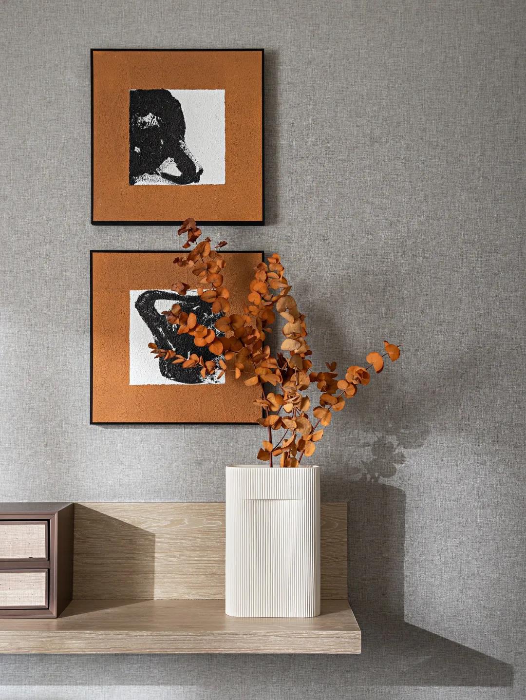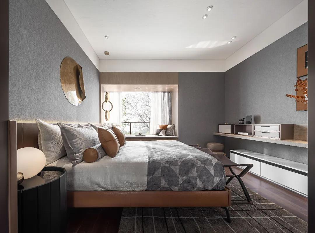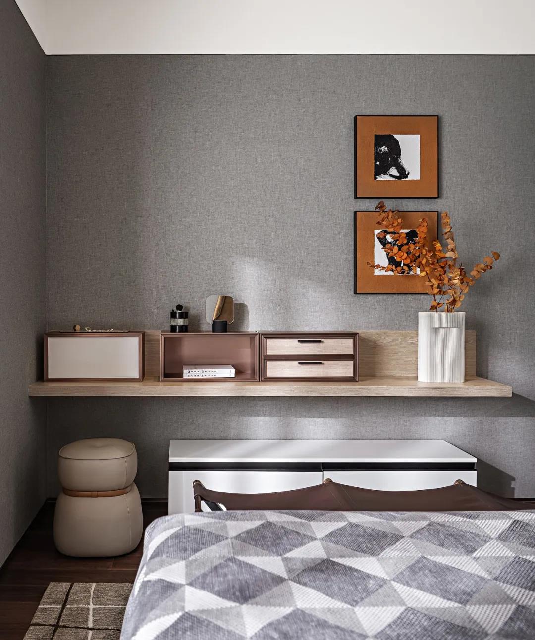 主臥以詩意化的意象鋪敘,令空間氣質在光影的映照下,呈現俊雅幽然的精尚感。不同飽和度的灰色調被加入其中,在調和空間亮色的同時為空間注入一抹寧靜;而落落黃葉的點綴,則將空間的情調氛圍推向更濃郁的表達中——秋意漸濃,心中的浮躁亦可隨風漸止。