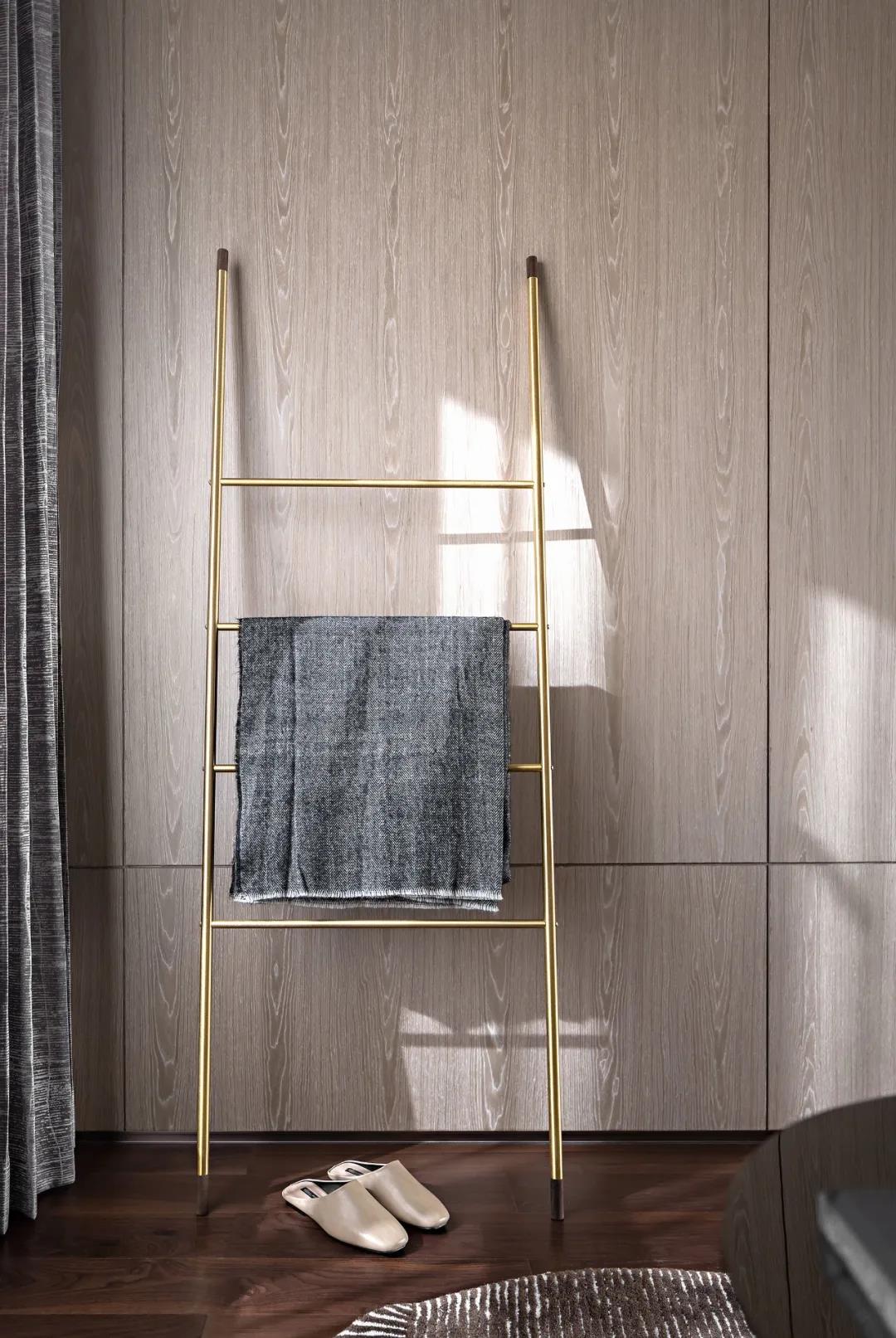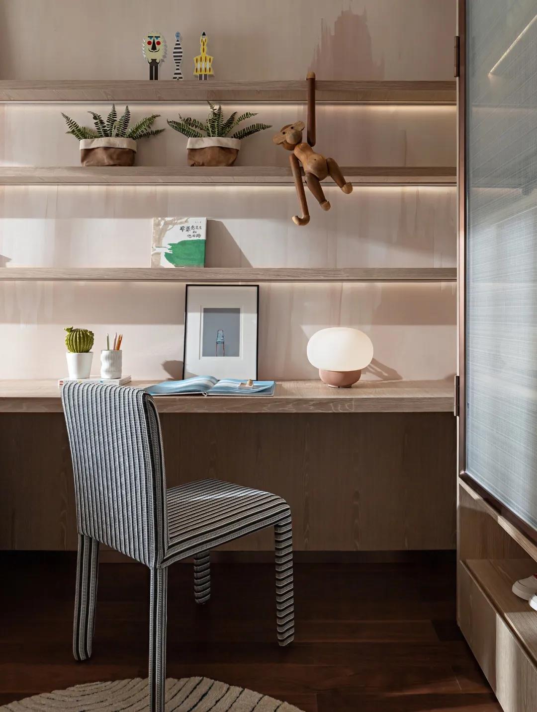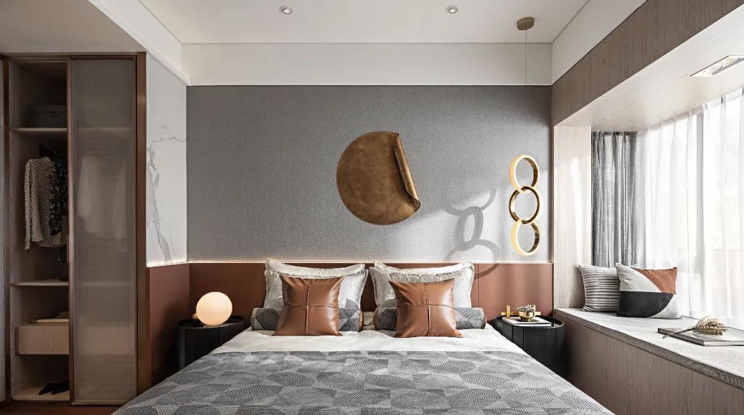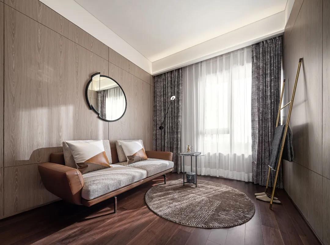 主臥以詩意化的意象鋪敘,令空間氣質在光影的映照下,呈現俊雅幽然的精尚感。不同飽和度的灰色調被加入其中,在調和空間亮色的同時為空間注入一抹寧靜;而落落黃葉的點綴,則將空間的情調氛圍推向更濃郁的表達中——秋意漸濃,心中的浮躁亦可隨風漸止。