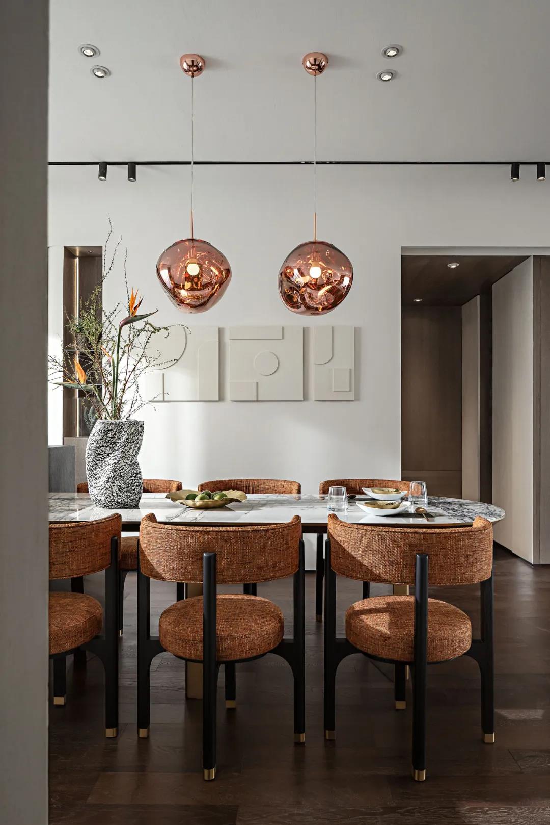餐廳以白色墻面背景劃分出與客廳的界線,兩種差異化色調在對比中形成有趣的空間對話。暖橘色跳躍于白色空間之中,為空間構建一處視覺焦點,同時也增添了一份靈動與俏皮。同一系列的兩款燈具分別出現于客廳與餐廳中,遙遙相望,相互呼應。