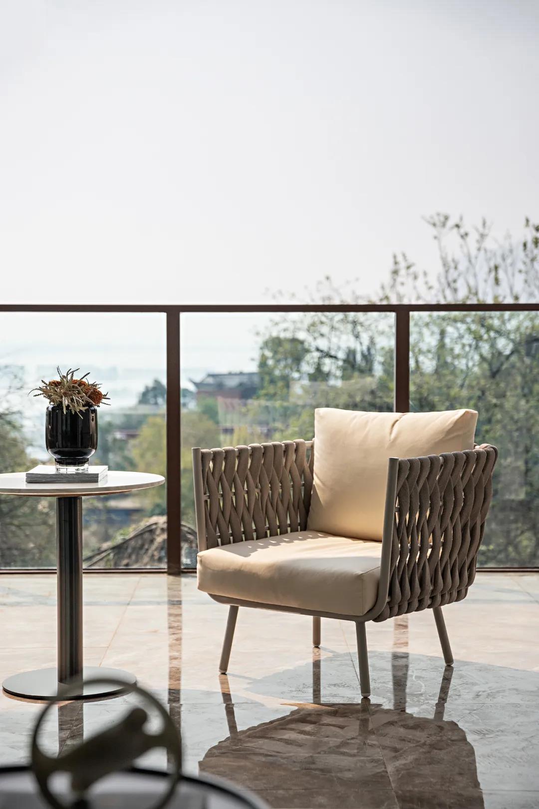 開放式的空間布局納入更多自然清氣,空間通透而明亮,線條分明的白色皮質沙發與少量黑色金屬元素的桌子、燈具搭配相得益彰,居者靜坐室內也可欣賞到窗外的綠意山景,若遇上昆明的雨天,山雨朦朧,便得以領略一番“畫堂人靜雨蒙蒙,屏山半掩余香裊”的意境之美。