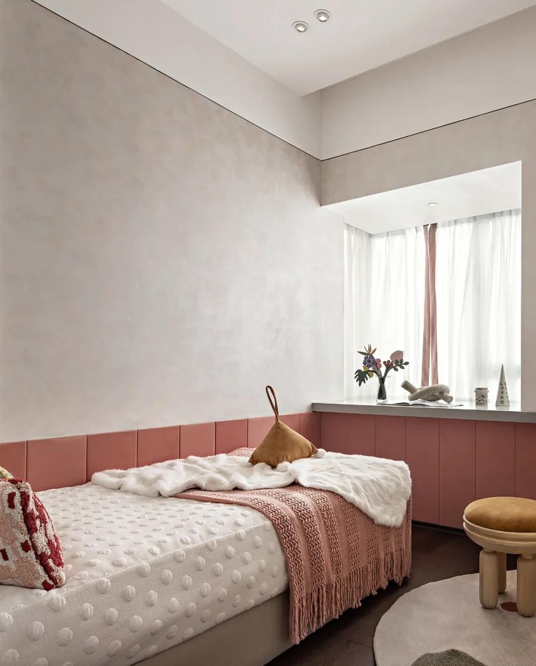 兒童房的設計,除了以童趣夢幻的色彩營造居住氛圍外,還在多個細節處體現人性化考量。為保障孩童的健康與安全,設計特別選用溫潤細膩的天然木質與柔軟舒適的布藝作為主材料,而弧形的飄窗頂部設計,也貼心地為孩子好動爬高的天性打造一把“保護傘”。