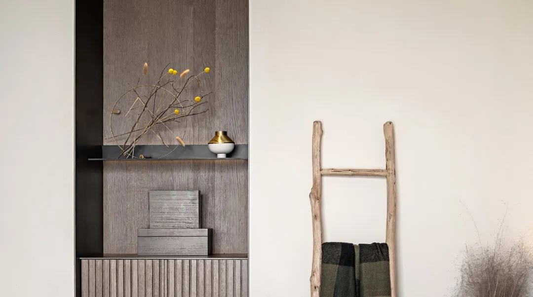 原木梯型置物架與風干植物、自然石材、條紋布藝的搭配運用,為空間注入了有趣的律動,同時也賦予空間一種曠野之美,讓人仿佛置身于戶外原野之中。設計師運用簡單的陳設手法營造自然之美,這也是本案最大的亮點之處。