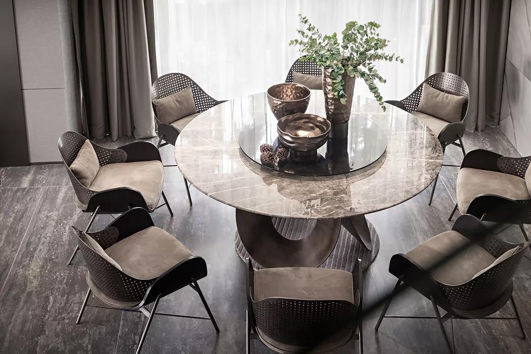 餐廳與客廳開敞聯合,有效拓展了公共區域的活動范圍與分區層次,超大化挖掘相鄰場域的滲透與交互,大理石背景亦成為空間共同語匯,回應了現代人返樸歸真的訴求。以個性銅材餐桌與擺設營造氣息輕爽的用餐環境,邊用餐,邊感受藝術之美,感悟生活之味。