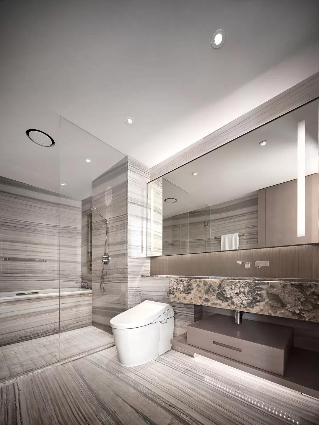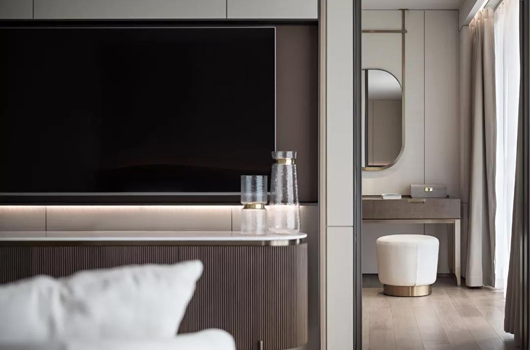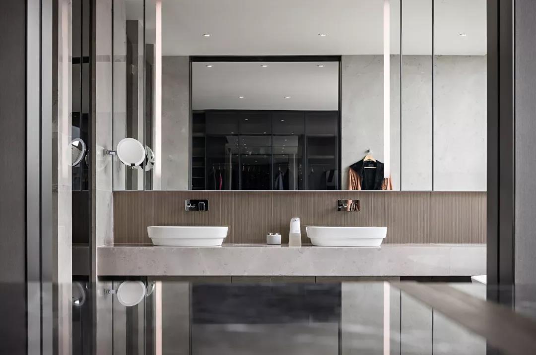 臥室和衛生間通過條紋地毯與大理石紋理進行象征性的貫穿,產生流動感,高級氣質中更加彰顯輕松寫意。