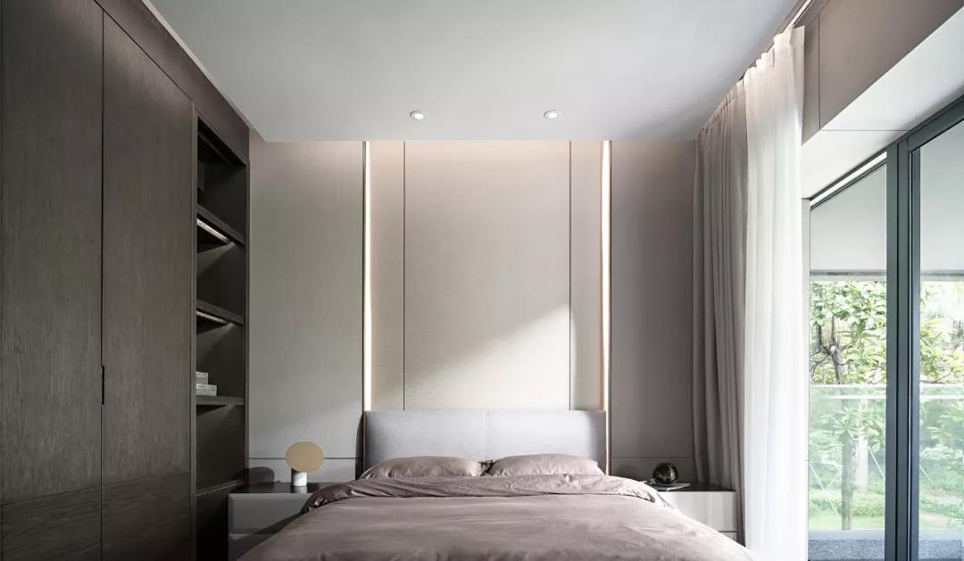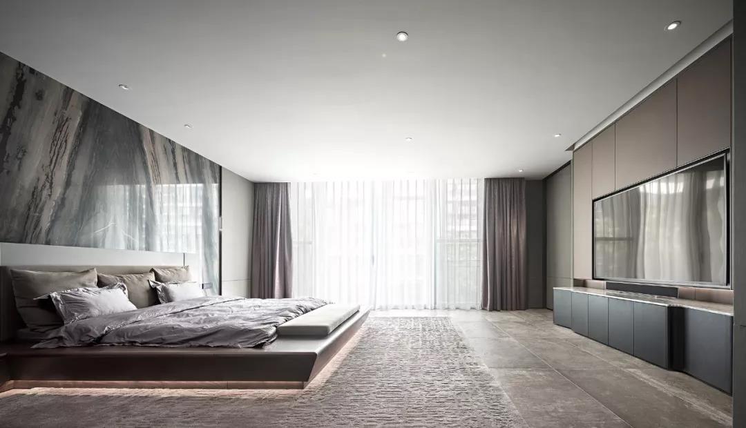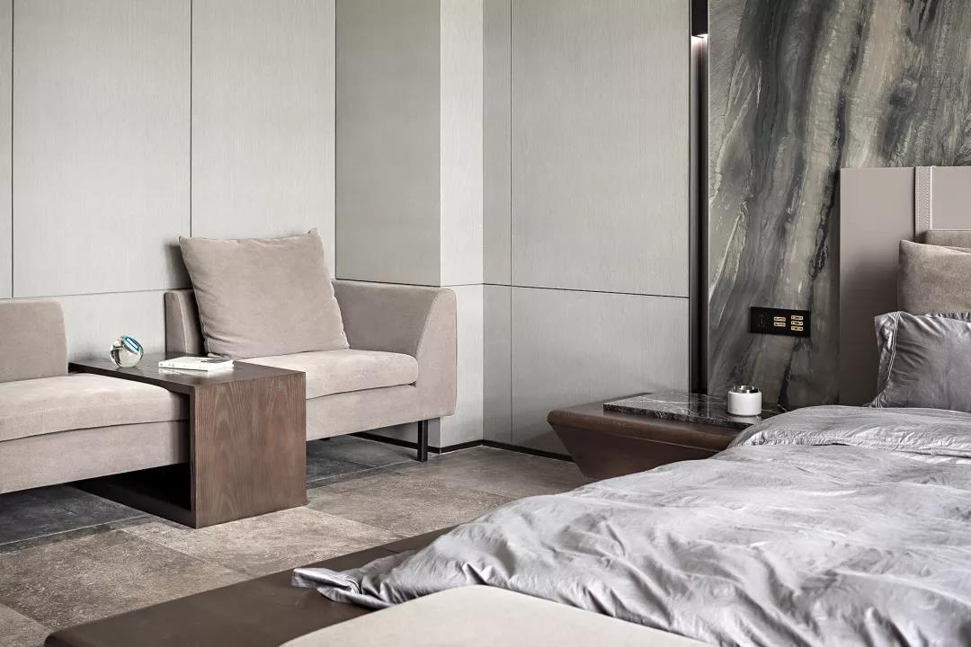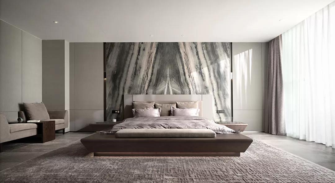 進入主臥,大理石背景墻和客廳餐廳背景墻設計如出一轍,作以造型延伸。莫蘭迪色與諸多質感層次的碰撞與交融,增加一種高級和舒適的氛圍感,設計師將對家的理解溫暖地投注進去。