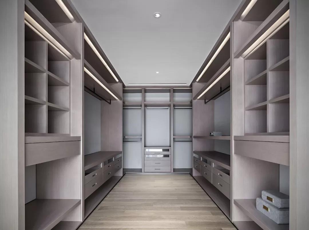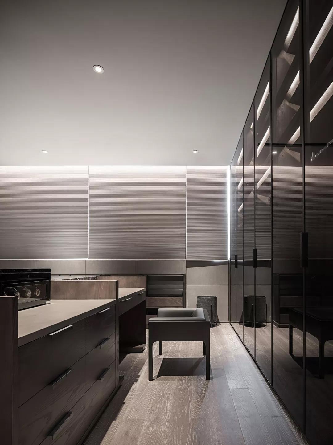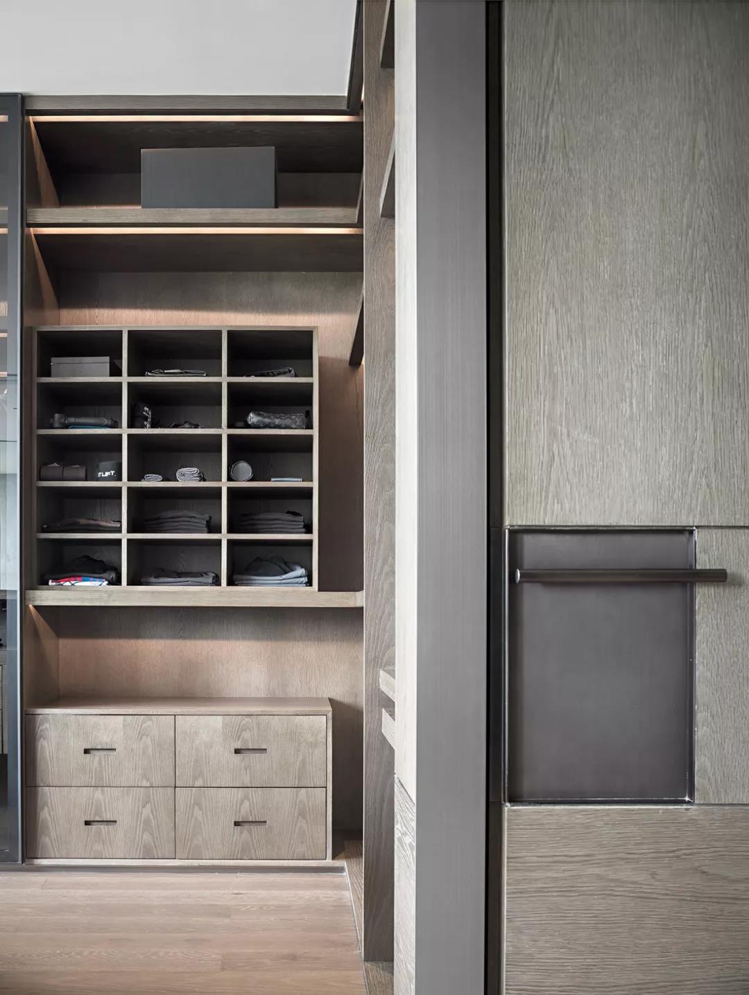 衣帽間環視所見,硬朗與柔軟、溫潤與質感、點與線、大與小......交融共舞。這皆是設計師精準拿捏室內尺寸、收納比例、構圖審美及細節重視的絕佳證明。