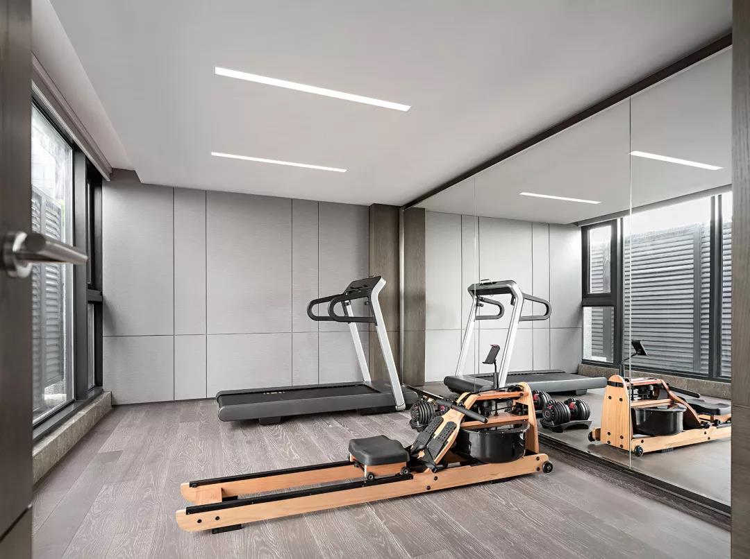 健身房空間通過整體延續的方式,莫蘭迪色調及木地板材質再次相互滲透、融會貫通。