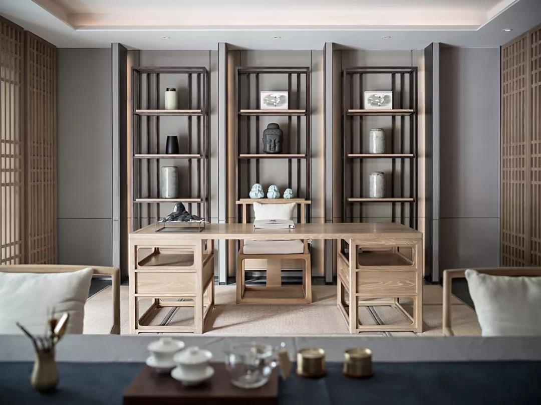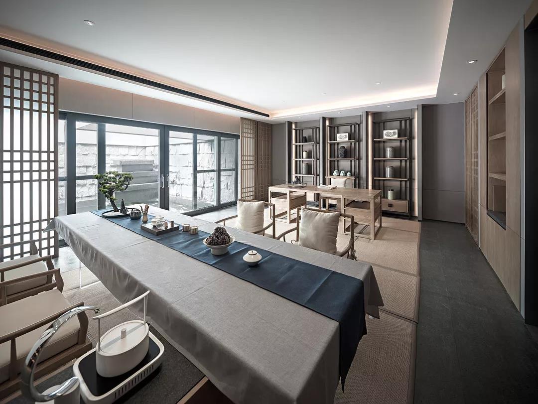 茶室整體色系上采用了溫潤的茶湯色,設計元素的呼應與融合在此運用嫻熟。中式家具及茶臺都極具體塊與線條韻律,畫作簡約的筆觸勾勒藝術感知,納萬象于方寸之中。自然而然將人的視線引向上方。
