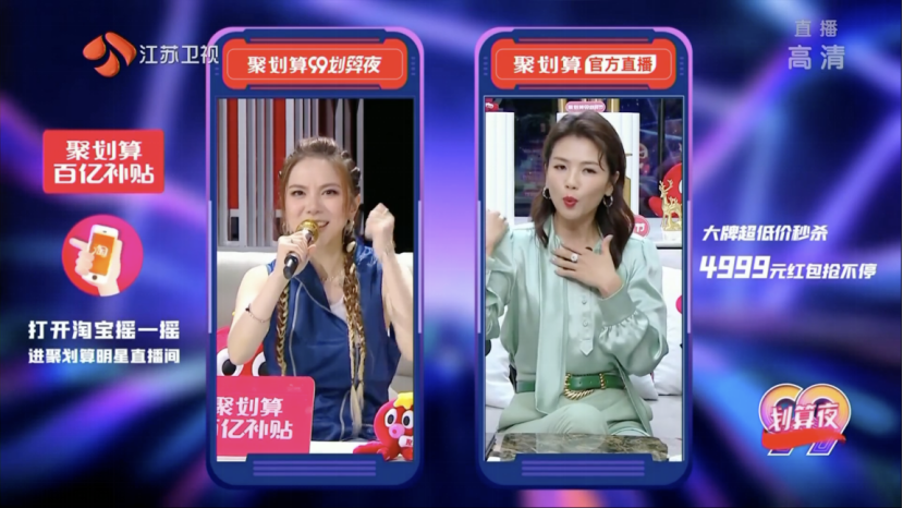 區(qū)別貓晚的綜藝狂歡,江蘇衛(wèi)視與淘寶聯(lián)合打造的全網(wǎng)首個(gè)全明星晚會(huì)——聚劃算99劃算夜,則邀請(qǐng)明星進(jìn)入直播間,進(jìn)行沉浸式體驗(yàn),并以一大一小兩屏的呈現(xiàn),為用戶(hù)帶去福利+好物推介的購(gòu)物歡樂(lè)。