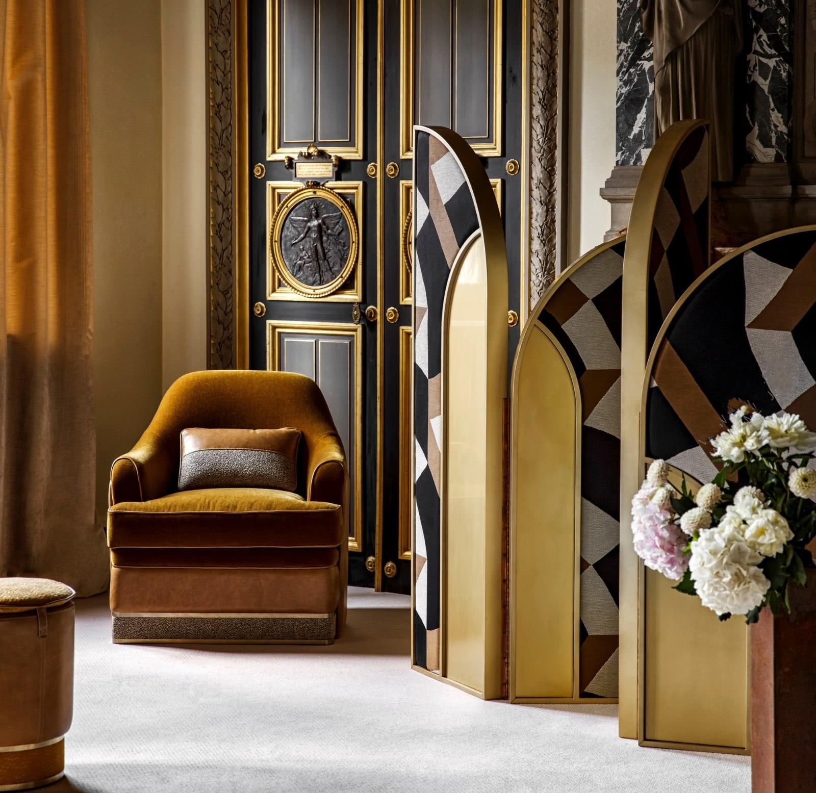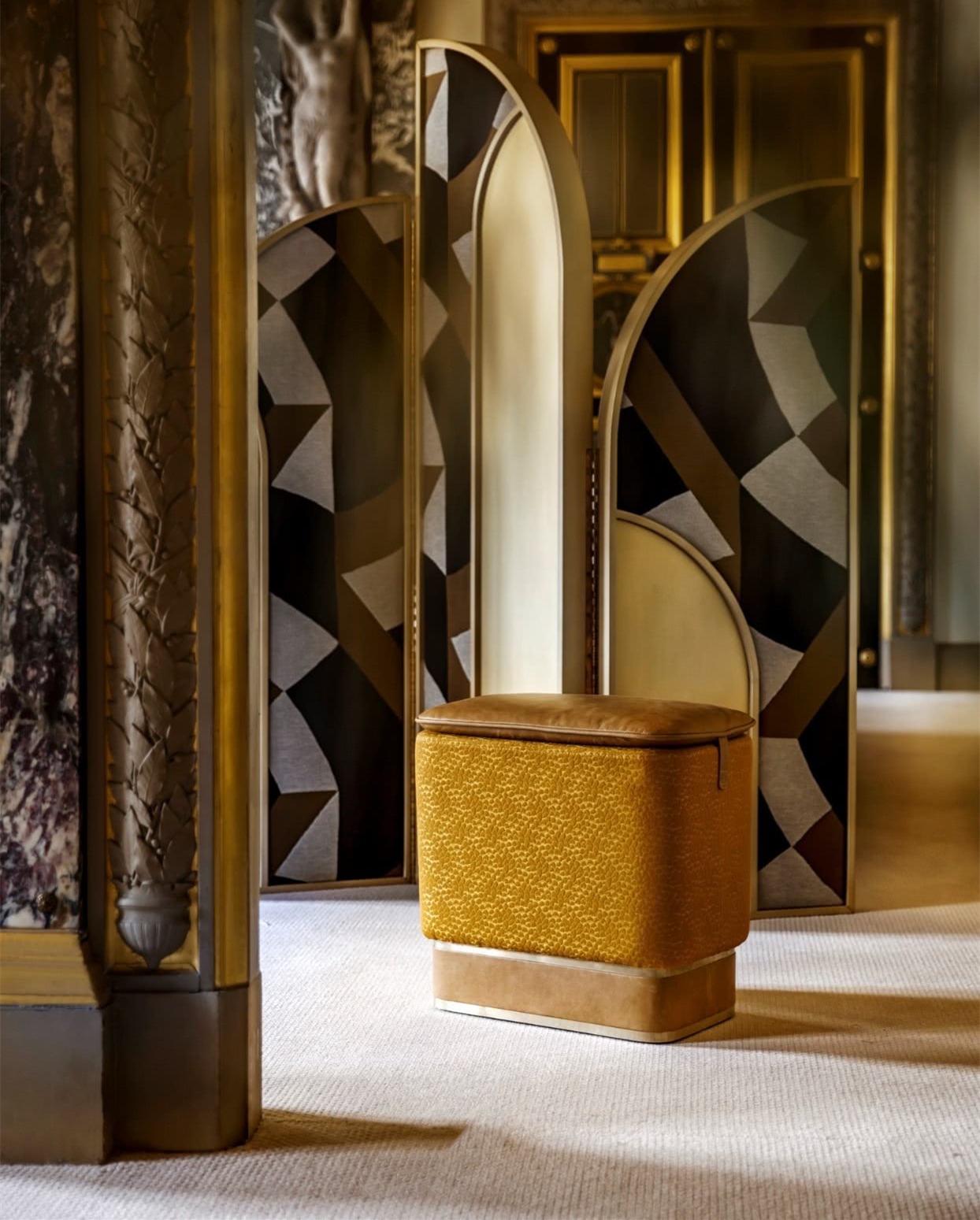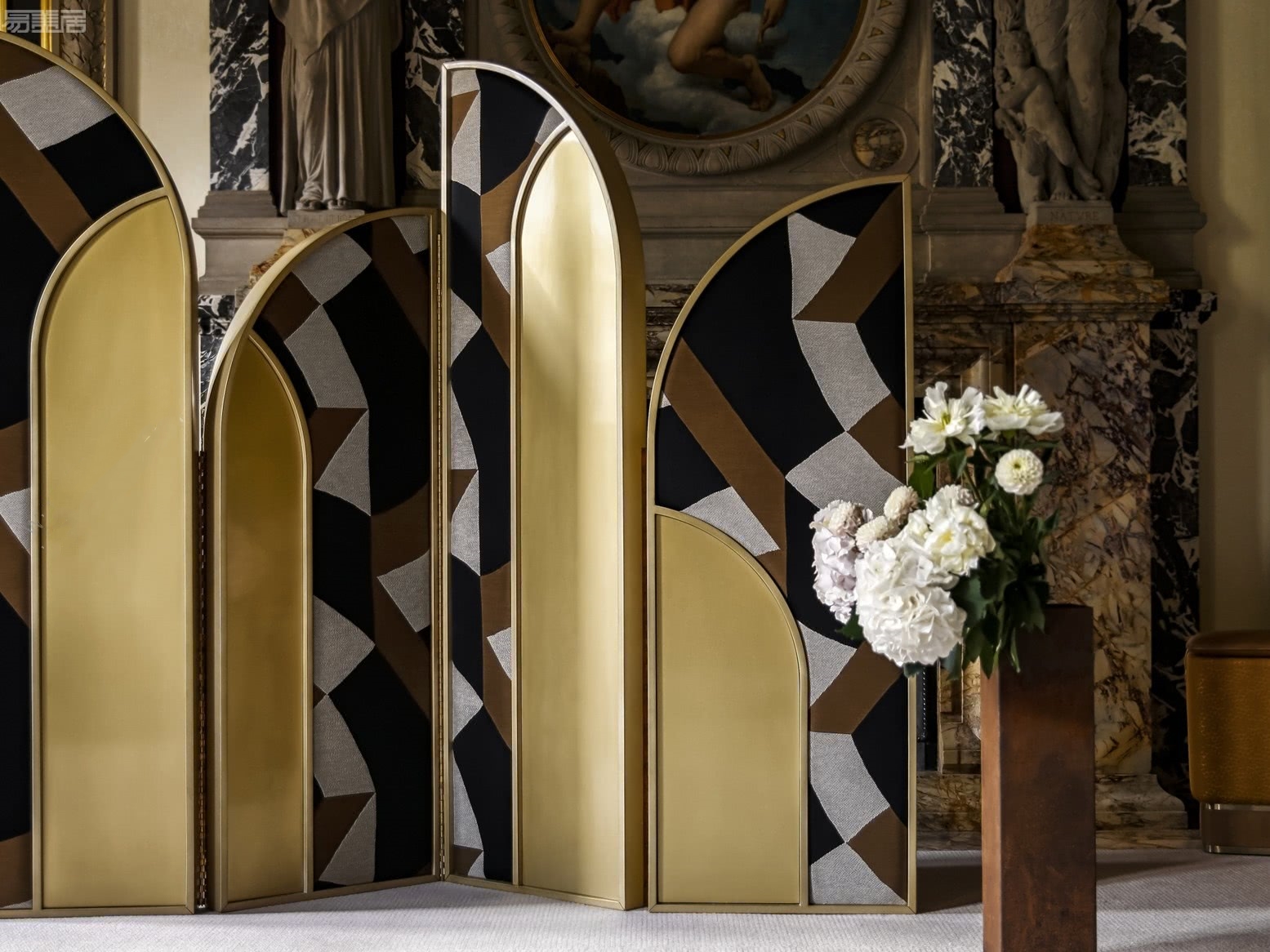 多種形式的Mogador屏風為空間帶來氛圍,而又不會破壞其視野。Lelièvre Paris壯觀的Dalai Lampas結合金色漆飾面有效地突出了其平滑的曲線。Mogador是一款直截了當的屏風,可以細膩地保護您的親密關系。