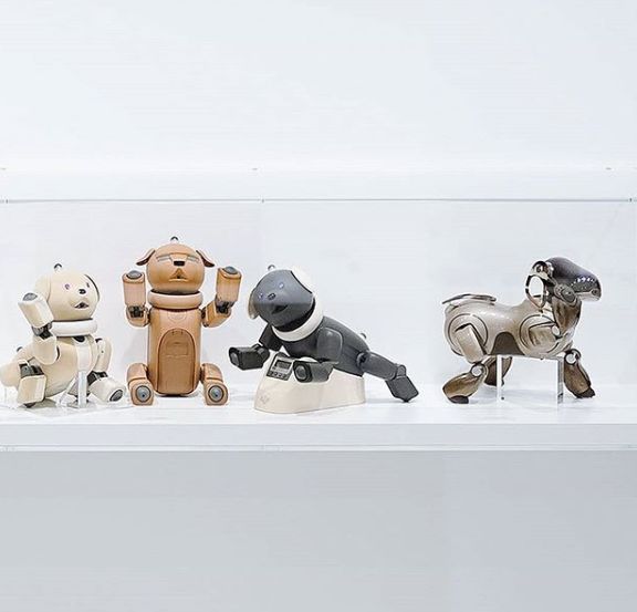 走進(jìn) Sony Park 的負(fù)一層,可以看到接待的前臺(tái)和一些藝術(shù)海報(bào),休閑區(qū)還有兩只 AIBO 機(jī)器狗和到訪的游客互動(dòng)。