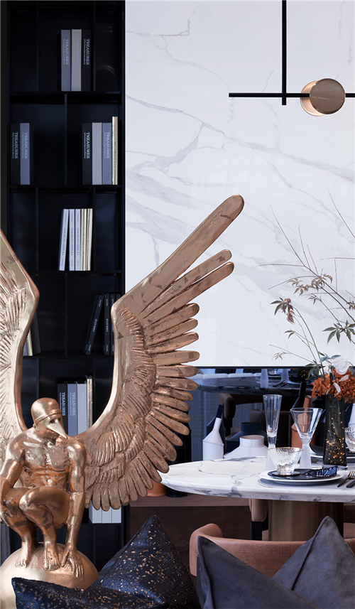 飛行少年藝術雕塑靜靜的蹲坐在窗邊,如靜思,如凝望,成為了客餐廳的視覺焦點。