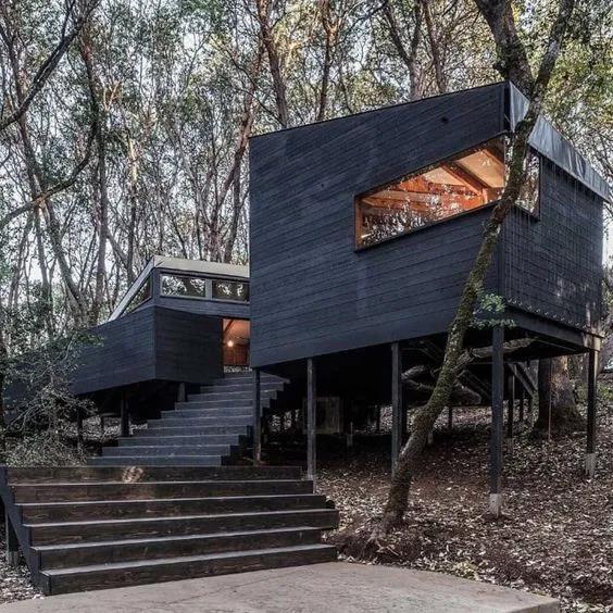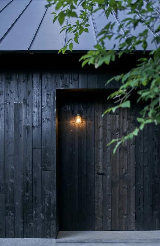 燒杉板做成的建筑更適合森林中的野奢小屋,燒杉板本就是木材,與原木相比更多了現代美感。防蚊蟲、防火、防潮、防腐對于森林中的小屋而言更是神助攻。安全性與堅固度也不需要擔心,經過炭化處理的燒杉板可以使用達80年之久。