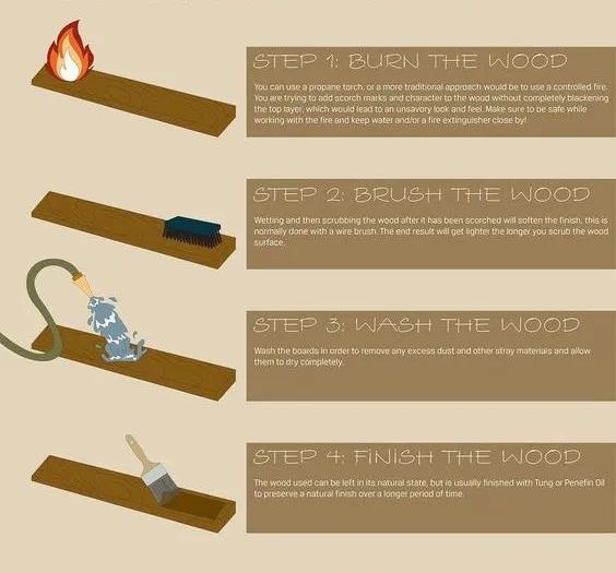 燒杉板的制作步驟主要有:炭化、清洗、上油,三步來完成,炭化是其中最重要的關鍵步驟。