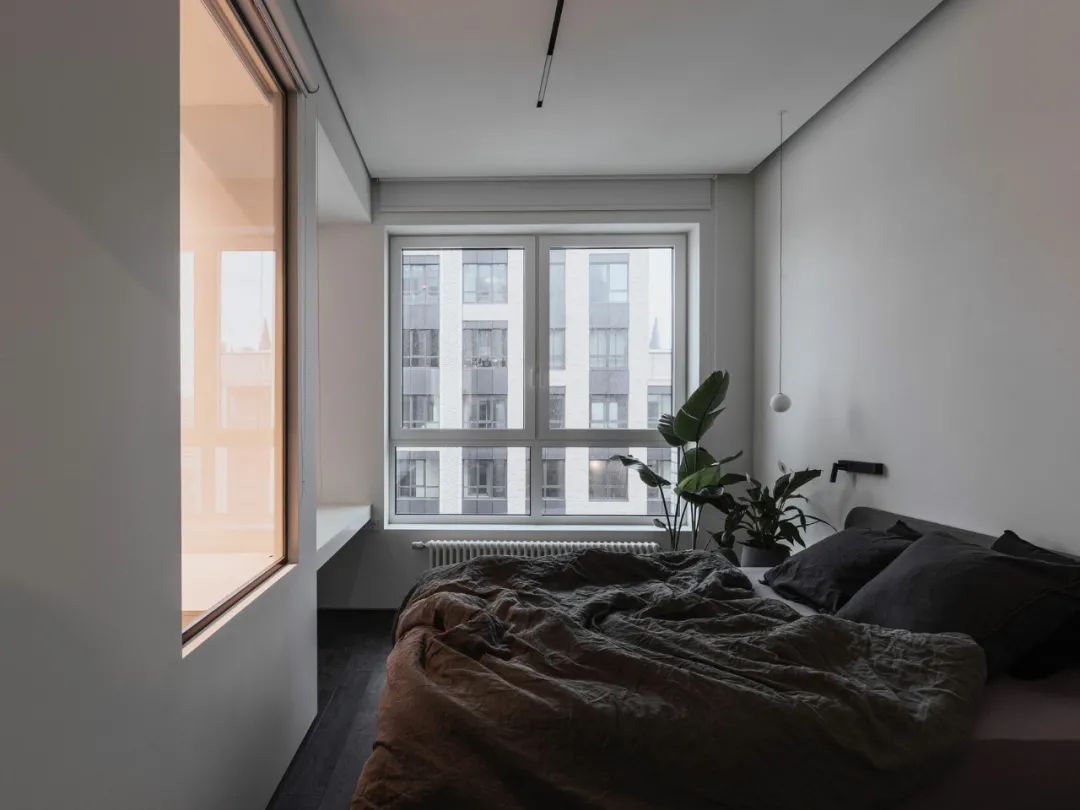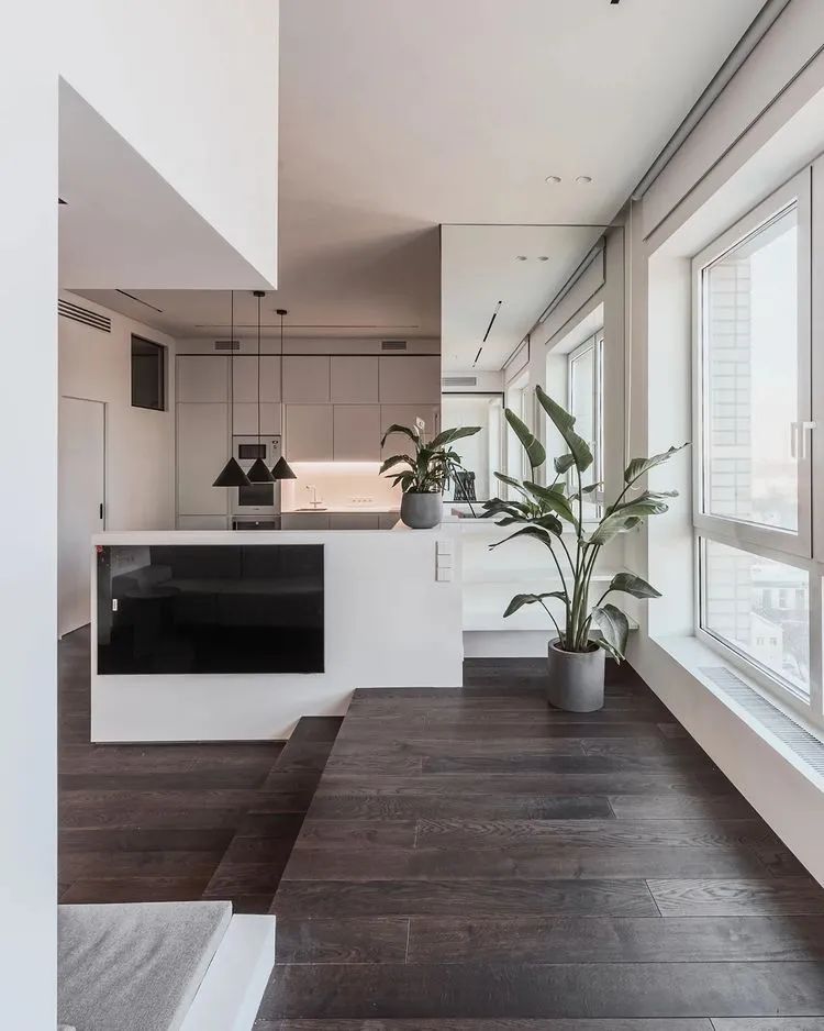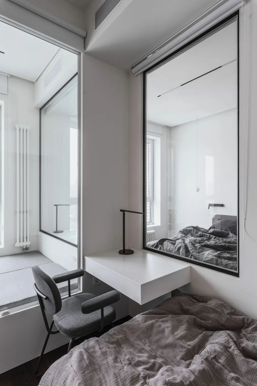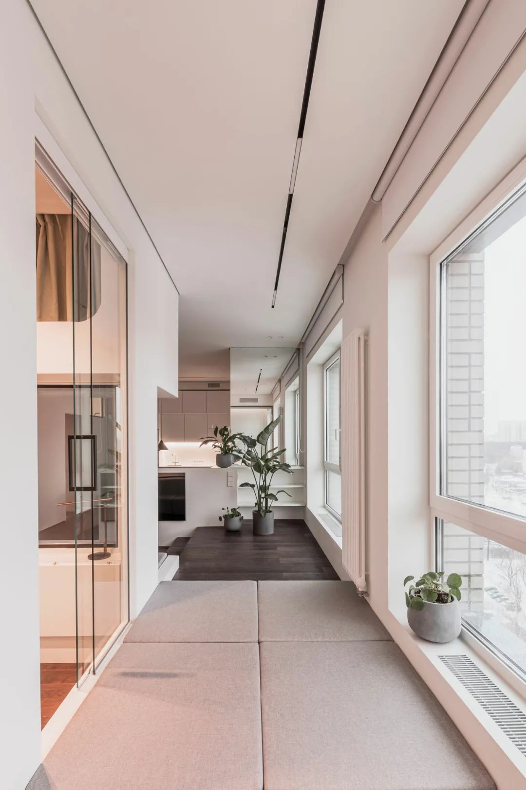 公寓的最大優(yōu)點是其中一堵外墻上有4扇大窗戶,對我們來說,保持這些窗戶沿線的空間完整是非常重要的,而不是用空白的墻壁分隔它。因此,沿著窗戶出現(xiàn)了一個單獨的休閑區(qū),所有的房間也都是面向的。